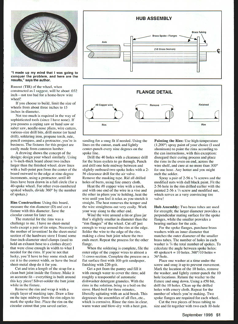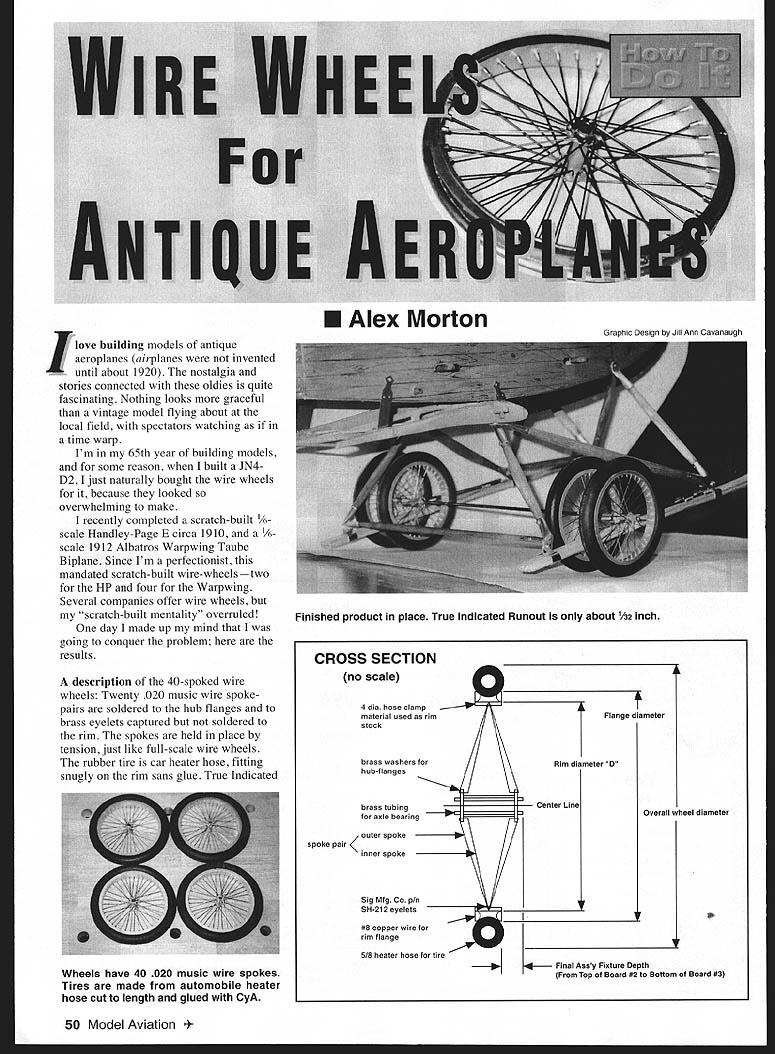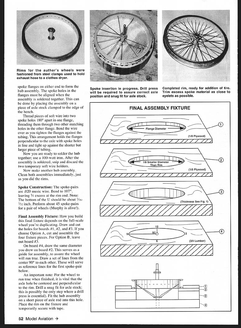 I N 7 love building models antique aeroplanes airplanes invented until about 1920 nostalgia stories connected oldies quite fascinating Nothing looks graceful vintage model flying about local field spectators watching time warp Im 65th year building models some reason built JN4D2 just naturally bought wire wheels because looked overwhelming make recently completed scratch-built 1/6. scale Handley-Page E circa 1910 /6scale 1912 Albatros Warpwing Taube Biplane Since Im perfectionist mandated scratch-built wire-wheelstwo HP four Warpwing Several companies offer wire wheels scratch-built mentality overruled day made up mind Iwas going conquer problem results description 40-spoked wire wheels Twenty 020 music wire spokepairs soldered hub flanges brass eyelets captured soldered rim spokes held place tension just like full-scale wire wheels rubber tire car heater hose fitting snugly rim sans glue True Indicated U Alex Morton CROSS SECTION no scale spoke pair II 4 dia hose clamp stock material used rim brass washers hub-flanges brass tubingCenier Line asie bearing Outer spoke inner spoke Sig Mig Co p/n SH-212 eyelets ___________ #8 copper wire rim flange 6/8 heater hose tire Graphic Design Jill Ann Cavanaugh Flange diameter Rim dl meter 0 Overall heel diameter 4 Final Assy Fixture Depth Top Board #2 Bottom Board #3 50 Model Aviation shed product place True Indicated Runout about /32 inch Wheels have 40 020 music wire spokes Tires made automobile heater hose cut length glued CyA Runout TIR wheel constructed suggest will about 032 inchnot too home-brew wire wheel choose build limit size wheels about three inches 15 inches diameter too much required way sophisticated tools since have possess coping saw band saw saber saw needle-nose pliers wire cutters various-size drill bits drill motor hand drill soldering iron propane torch rule pencil compass protractor youre business fixtures project easily made common lumber drawing shows concept design design wheel similarly Using 3/i-inch-thick board about two inches larger finished wheel draw lines ball-point pen center board outward edge nine-degree increments using protractor until 40 lines have drawn full circle 40-spoke wheel other even-numbered spoked wheels divide 3600 number spokes Rim Construction Using board measure rim diameter D cut fixture diameter Save circular cutout later use material rims challenge have no sheet-metal tools except pair tin snips Necessity mother invention sheet-metal section hardware store found some four-inch-diameter steel clamps used hold exhaust hose clothes dryer close enough width what needed rims youre lucky youll have buy some stock cut correct width have local sheet-metal shop Cut trim length strap clean butt joint inside fixture Make accurate fiteverything built around key piece Silver-solder butt joint fixture Remove rim wrap single layer masking tape Draw line tape midway rim edges mark spoke line Place rim circular cutout saved earlier sanding snug fit needed Using lines cutout mark lightly center-punch nine degrees spoke line Drill 40 holes clearance drill brass eyelets go through Punch drill hole midway between slightly outboard two spoke holes 256 clearance drill air valve Remove masking tape Rid drilled holes burrs using fine emery cloth Heat #8 copper wire torch end wire vise other pliers youre holding heat wire until feel relax stretch straight heat removes temper wire straightens out very easily Work way along other end Wind wire around tin glass jar thats slightly smaller diameter rim flanges wheel Cut off just enough wrap around rim edge Solder wire edge rim making close butt joint two ends meet Repeat process other flange soldering complete file outer edge copper wires almost /2 cross-section Complete process flat surface first 100-grit sandpaper finishing 220-grit Get pot pantry fill enough water cover rims add roughly teaspoonful automatic dishwasher detergent granules rims solution bring boil stove Hard-boil three minutes liberally agitating acid brush degreases assemblies flux etc corrosive Rinse rims clear warm water blow-dry heat gun Painting Rim Use high-temperature 12000 spray paint choice used aluminum paint rims according can instructions exception disregard curing process place rims oven end across wire shelf cure no 3000 hour Any hotter might melt solder Spray pair 2-56 x /4 screws modified nuts dull black paint Fit 2-56 hole rim drilled earlier painted 2-56 x w modified nut serves very convincing tire valve Hub Assembly Two brass tubes used strength larger diameter provides perpendicular mating surface spoke flanges smaller provides bearing surface axle spoke flanges purchase brass washers inner diameter matches outer diameter smaller brass tubes number boles washer total number spokes calculate angle between spoke holes 40 spokes/4 oles 3600/10 holes hole Place washer time under screw snug up prevent movement Mark location 10 holes remove washer lightly center-punch 10 hole locations Return washer fixture snug down Using #50 bit drill 10 holes Clean up drilled holes emery cloth Repeat number wheels youre making Two spoke flanges required wheel Cut two pieces brass tubing size fit together two 10-hole September 1998 51 HUB ASSEMBLY Brass Tubing Brass Spoke Flanges Axle 1/2 Cross Section made up mind going conquer problem results says author FLANGE DETAIL 1*8 Copper WireRemoveFinished RimRim spoke flanges either end form hub assembly spoke holes flanges must aligned assembly soldered together can done placing assembly piece axle stock clamped edge bench Thread pieces soft wire two spoke holes 1800 apart flange threading through two other matching holes other flange Bend wire over tighten flanges against tubing arrangement holds flanges perpendicular axle spoke holes line tight up against shorter larger piece tubing Now ready solder hub together use 100-watt iron After assembly soldered snip discard two temporary soft wire holders Now make another hub assembly Clean both assemblies immediate