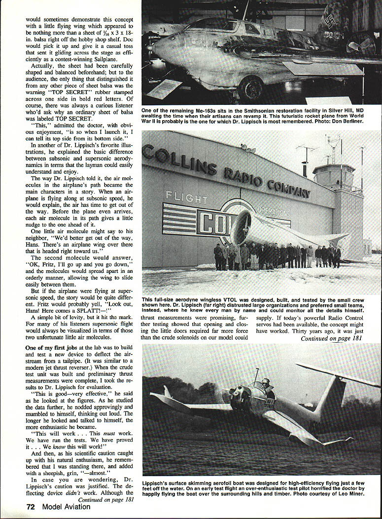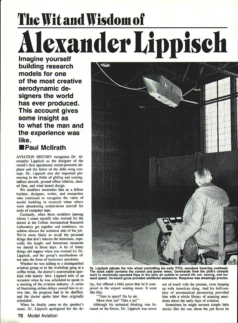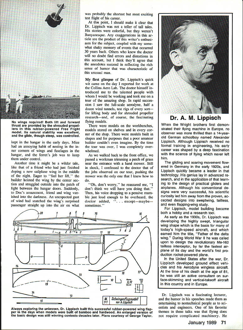 The Wit Wisdom 0 Alexander Lippisch Imagine yourself building research models creative aerodynamic de signers world has ever produced account gives some insight what man experience like U Paul Mcllrath AVIATION HISTORY recognizes Dr Al exander Lippisch designer worlds first operational rocket-powered air plane father delta wing con cept Dr Lippisch also did important pio neering fields gliding soaring tailless aircraft ground effect vehicles duct ed fans wind tunnel design modelers remember him fellow builder designer writer researcher continued recognize value model building research others abandoning scaled-down aircraft reels computer tape Curiously modelers among count myself worked doctor Collins Aeronautical Research Laboratoiy get together reminisce seldom discuss technical side job likely recall personal things dont interest historians espe cially laughs humorous moments shared days lot funny things did happen worked Dr Lippisch groups recollections ten take form humorous anecdotes Whether talking distinguished aviation group workshop gang coffee break doctors conversation spar kled humor Mrs Lippisch tells occasion scheduled speak meeting aviation industry series frustrating airline delays caused him ar rive late program shuffled doctor spoke later originally scheduled finally came speakers stand Dr Lippisch apologized de lay offered liffle poem hed com posed airport waiting room went like Time spare Go air time yet Take jet Although technical thinking fo cused future Dr Lippisch never out touch present keeping up American slang half-cen tury aeronautical pioneering provided him whole library amusing anec dotes about early days aviation Sometimes might recount simple little stories like about pet ferret 70 Model Aviation Dr Lippisch adjusts trim wheel controlling early VTOL aerodyne hovering overhead slack cable contains control power wires Commands pilots console went electrically operated flaps belly air outlets control lift roll turning ward speed On-board gyros provided additional assistance Response amazingly precise No wings required Both lift forward thrust provided shrouded propel lers rubber-powered Free Flight model Its natural stability excellent glide though steep controlled probably shortest exciting test flight career point should make clear Dr Lippisch teller tall tales stories colorful werent Bunyanesque Any exaggerations ar tide product writers enthusi asm subject coupled some what shaky memory events occurred 30 years back Others knew doctor will no doubt find errors distortions account think theyll agree anecdotes succeed reflecting rich sense humor characteristic unusual man first glimpse Dr Lippischs quick wit came day reported work Collins Aero Lab doctor himself troduced talented people would working took tour amazing shop rapid succes sion saw full-scale aerodyne half dozen wind tunnels test rigs sort lifting body shrouded propeller researchand course fascinating flying models models workbenches models stored shelves cor ner shop models built shapes purposes poor amateur builder couldnt imagine time tour over completely over whelmed As walked back front office passed workman trimming patch grass near entrance hand mower Still shock confessed doctor jobs observed tour pushing mower knew kept hangar early days Mice annoying habit nesting ner corners wings fuselages hangar ferrets job keep under control Another time might wilder tale like friend just finished doping new sailplane wing middle night Eager feel lift builder hoisted wing center sec tion struggled outside patch light between hangar doors Suddenly Docs amazement friend wing van ished darkness An unexpected gust wind snatched wings surprised passenger straight up air what 20191815 8 14---- 17 19 13 Oh dont worry reassured dont think will have doing voice dropping pensive mum ble just loud enough overheard doctor added ceptmaybe sometimes 367 11l--.j 254211 10 7K U~70 Li 51211 Wright brothers first demon strated flying machine Europe no observer thrilled 14-yearold German schoolboy named Alexander Lippisch Although Lippisch received no formal training engineering early career shaped deep fascination science flying never left him gliding soaring movement flow ered Germany early 1920s Lippisch quickly became leader technology genius lay advanced re search application learn ing design practical gliders airplanes Although conventional de signs very successful scientific curiosity led him away proven ac cepted designs sweptwing tailless flapping-wing study Lippisch model building became both hobby research tool As early 1930s Dr Lippisch developing highly swept triangular wing shape basis todays high-speed aircraft earned him title Father delta wing During World War II called upon design revolutionary Me-163 tailless interceptor far fastest air plane its day worlds first pro duction rocket-powered plane United States after war Dr Lippisch developed ground effect vehi cles Aerodyne wingless aircraft time death age 81 still active consultant sur face-skimming vertical-takeoff aircraft country Europe 13 Al Always exploring unknown Dr Lippisch built successful rubber-powered wing flap per days models built bamboo hardwood An enlarged version basic design still winning contests decades later Plans courtesy George Taylor Dr Lippisch fascinating lecturer humor speeches made entertaimng nontechnical people sci entists engineers favorite themes talks flying does require complicated machinery January 1989 71 Dr M Lippisch would sometimes demonstrate concept little flying wing appeared nothing sheet A6 x 3 x 18m balsa right off hobby shop shelf Doc would pick up give casual toss sent gliding across stage effi ciently contest-winning Sailplane Actually sheet carefully shaped balanced beforehand audience thing distinguished other piece sheet balsa warning TOP SECRET rubber stamped across side bold red letters course always curious listener whod ask ordinary sheet balsa labeled TOP SECRET admitted doctor obvi ous enjo
