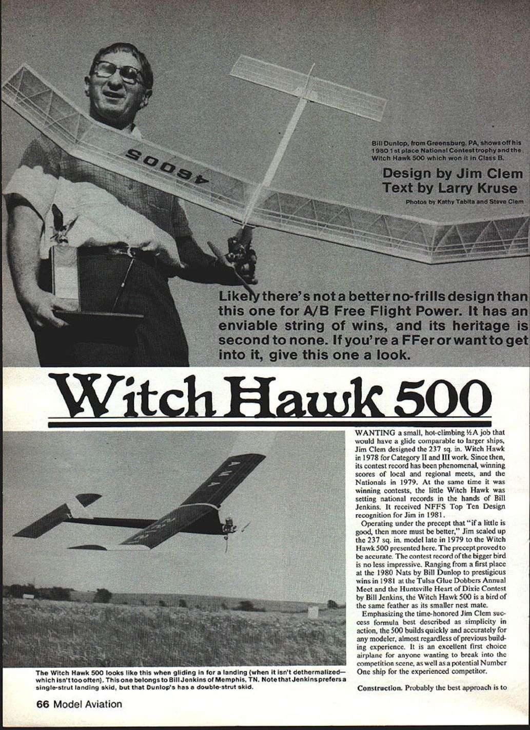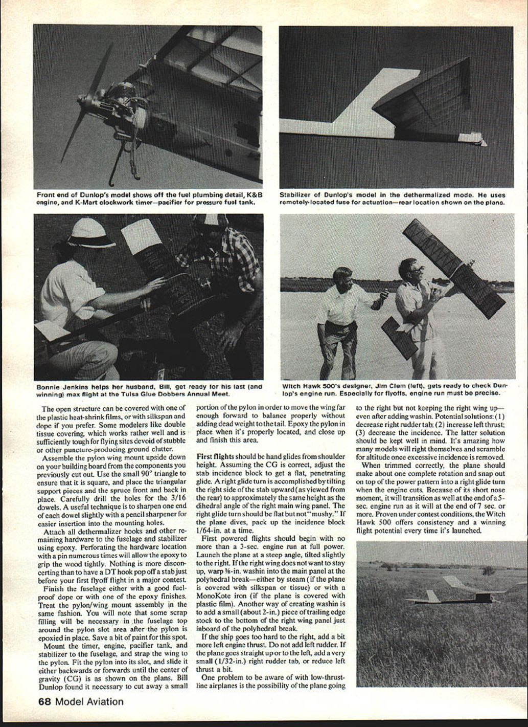 Witch IIawk 500 WANTING small hot-climbing job would have glide comparable larger ships Jim Clem designed 237 sq Witch Hawk 1978 Category II III work Since its contest record has phenomenal winning scores local regional meets Nationals 1979 same time winning contests little Witch Hawk setting national records hands Bill Jenkins received NFFS Top Ten Design recognition Jim 1981 Operating under precept little good must better Jim scaled up 237 sq model late 1979 Witch Hawk 500 presented precept proved accurate contest record bigger bird no less impressive Ranging first place 1980 Nats Bill Dunlop prestigious wins 1981 Tulsa Glue Dobbers Annual Meet Huntsville Heart Dixie Contest Bill Jenkins Witch Hawk 500 bird same feather its smaller nest mate Emphasizing time-honored Jim Clem suc cess formula best described simplicity action 500 builds quickly accurately modeler almost regardless previous build ing experience excellent first choice airplane anyone wanting break competition scene well potential Number ship experienced competitor Construction Probably best approach 66 Model Aviation Witch Hawk 500 looks like gliding landing isnt dethermalized isnttoooften Thisone belongsto Bill Jenkins Memphis TN Notethatenkins prefersa single-strut landing skid Dunlops has double-strut skid FULL-SIZE PLANS AVAILABLE. SEE PAGE 164 I-WIT I FUSELAGELITSIDE STOAT OMsOR3O ASREUtRO SURE PTEWIAWI MAT FOR WIWOR CA ELAGE TOP VIEW TTM TI TOFTIR TTI-OMIIR BOI-M SORRT 3/SO MUSK WIRE LA SOOTTOP WOO BOTTOM IM MI-MO3/00 SkI-SO 5010 RRWIIMROWIOMRMOLSA WIMOOOOJT 0501 MOM LTMOIMOTS IMO/TO0\t0\ITOTOOTOO WING P LAN LEFT SIDE IM-SO IROOBBO ROOST'7 1/ TO I/B MA MR RB M MOT IIAMIIOORI-OTKMTO TOTOJROAR PYLON TAnERN WITCH HAWK 500 IPOWEO BY 15 MAE think though kit instead being scratch-built translation way go pre-kit necessary components before starting construction phase fuselage pieces will need pre-cut sides top bottom pylon components plywood engine pieces interior formers critical pieces purposes align ment top bottom fuselage Since situtated inside fuselage sides dictate straight completed fuselage will Take special pains cut both pylon slot rudder slot accurately possible straight therell no assurance plane will fly should flying surfaces youll need pre-cut wing ribs stab ribs rudder Note rudder has spruce leading edge ward off hangar rash spars leading trailing edges stock sizes can pulled wood bin needed Now workbench littered bits pieces can start making some sense out covering plan Saran Wrap pinning down fuselage too over plan Install -in fuselage formers aid ofa small 900 triangle alignment guide sides next An aliphetic resin such Sig Bond useful type construciton because allows time make minor adjustments check alignment work go fuselage box completed adding bottom top since fuselage being built upside down Check pylon slot make sure formers have xcess glue might alter pylon incidence angle final assembly steps engine mount sandwich made layer 3/32 plywood 3/32 landing gear wire available NFFS Supplies 14 plywood engine mount pieces should epoxied together Fill area around gear wire scrap 3/32 balsa epoxy before installing assembly Note -in triangu lar balsa should inserted glued inside fuselage box Section AA additional gluing area prior epoxying engine mount position rudder should positioned carefully its slot glued place penetrates fuselage box depth -in fuselage top rudder must aligned perfectly pre dictable flight pattern occur plywood stab mount -in inci dence block complete basic fuselage struc ture glue pylon place time will installed last stage construction order may shifted locate CG properly Sand fuselage set aside until flying surfaces built main wing panels constructed flat building board Start pinning down ading edge strip both front rear bottom spars triangular trailing edge stock Install W-2 diagonal ribs omit W-1 ribs until dihedral installed Butt eading edge piece up against ribs glue tnem bottomleading edge 3/16 top spar can now cemented place omit turbulator spars until after W set panels joined tip panels require washout Prop up trailing edge tip rib juncture panels dry put dihedral blocking up panel required height epoxying leading trailing edges After dihedral joints locked place W- ls dihedral braces gussets turbulator spars can added Complete wing adding 3/16-in tips sand leading edge its final contour small template sheet alumi num can made assure accuracy sanding leading edge shape Sand rest wing carefully remove glue bumps fuzz set aside along fuselage stabilizer built identical wing except three center ribs should undercut after assembly accept 1/16 top sheeting template will also assistance final shaping leading edge contour After insetting split dowel pivot leading edge add 3/16-in tips sand structure did wing September 1982 67 03MRLMM / 7 STABILIZER VVflS lSDlII UUE1IOp5 oacK-iii WITCh riawk 500 shows off warp-resistant diagonal-ribbed wing stab good detail As FF models go simple buildflies great open structure can covered plastic heat-shrink films silkspan dope prefer Some modelers like double tissue covering works rather well sufficiently tough flying sites devoid stubble other puncture-producing ground clutter Assemble pylon wing mount upside down building board components previously cut out Use small 900 triangle ensure square place triangular support pieces spruce front back place Carefully drill holes 3/16 dowels useful technique sharpen end dowel slightly pencil sharpener easier insertion mounting holes Attach dethermalizer hooks other re maining hardware fuselage stabilizer using epoxy Perforating hardware location pin numerous times will allow epoxy grip wood tightly Nothing discon certing have DT hook pop off stab just before first flyoff flight major contest Finish fuselage either good fuelproof dope epoxy finishes Treat pylon/wing mount assembly same fashion will note some scrap filling will necessary fuselage top around pylon slot area after pylon epoxied place Save bit