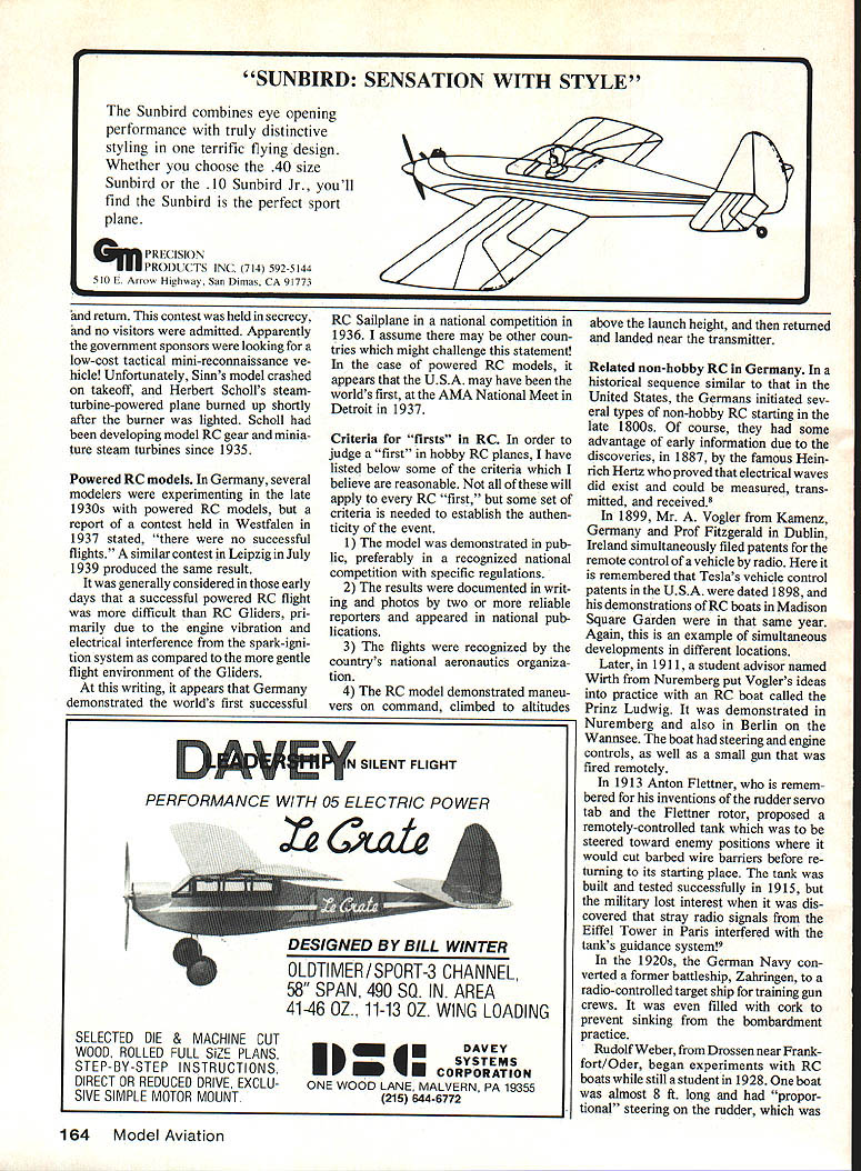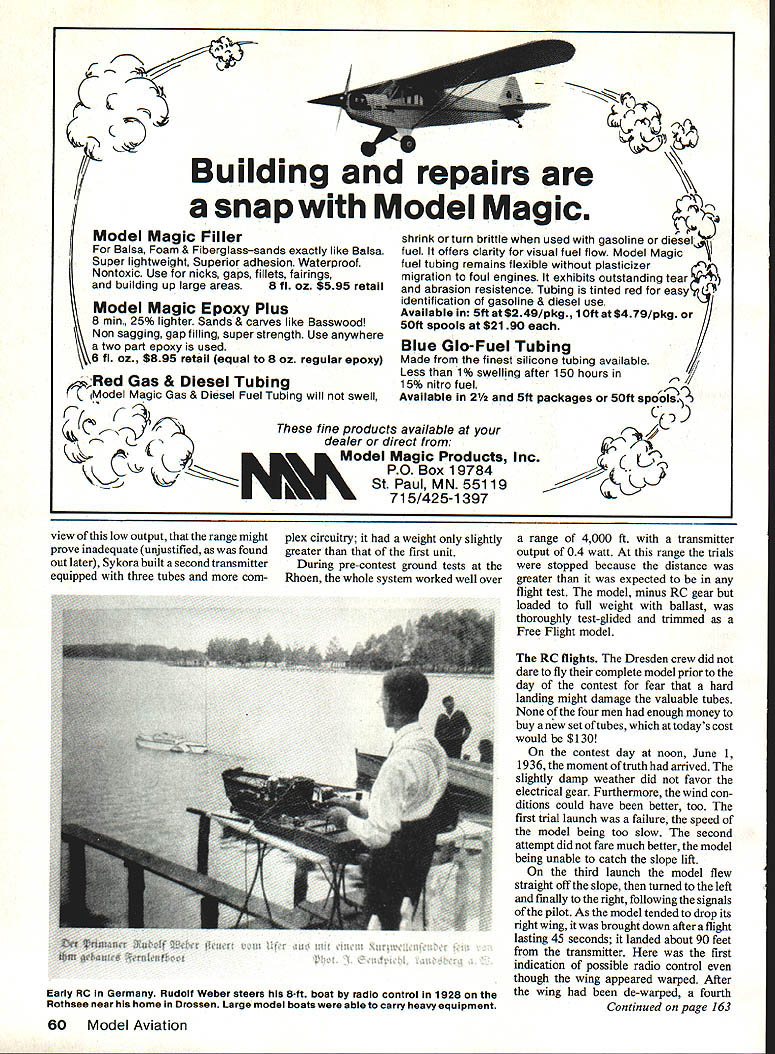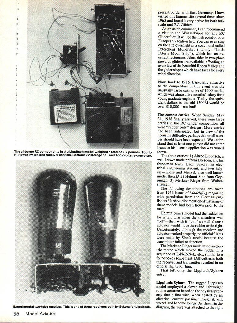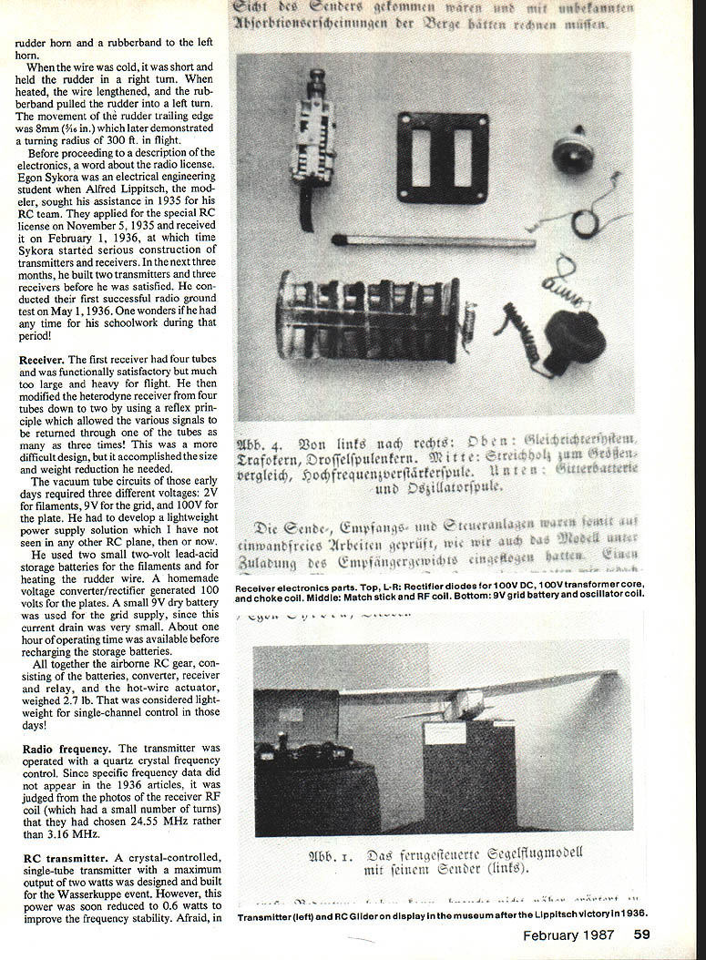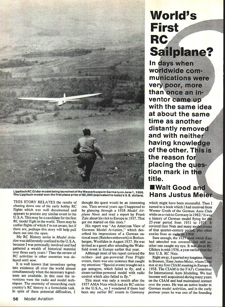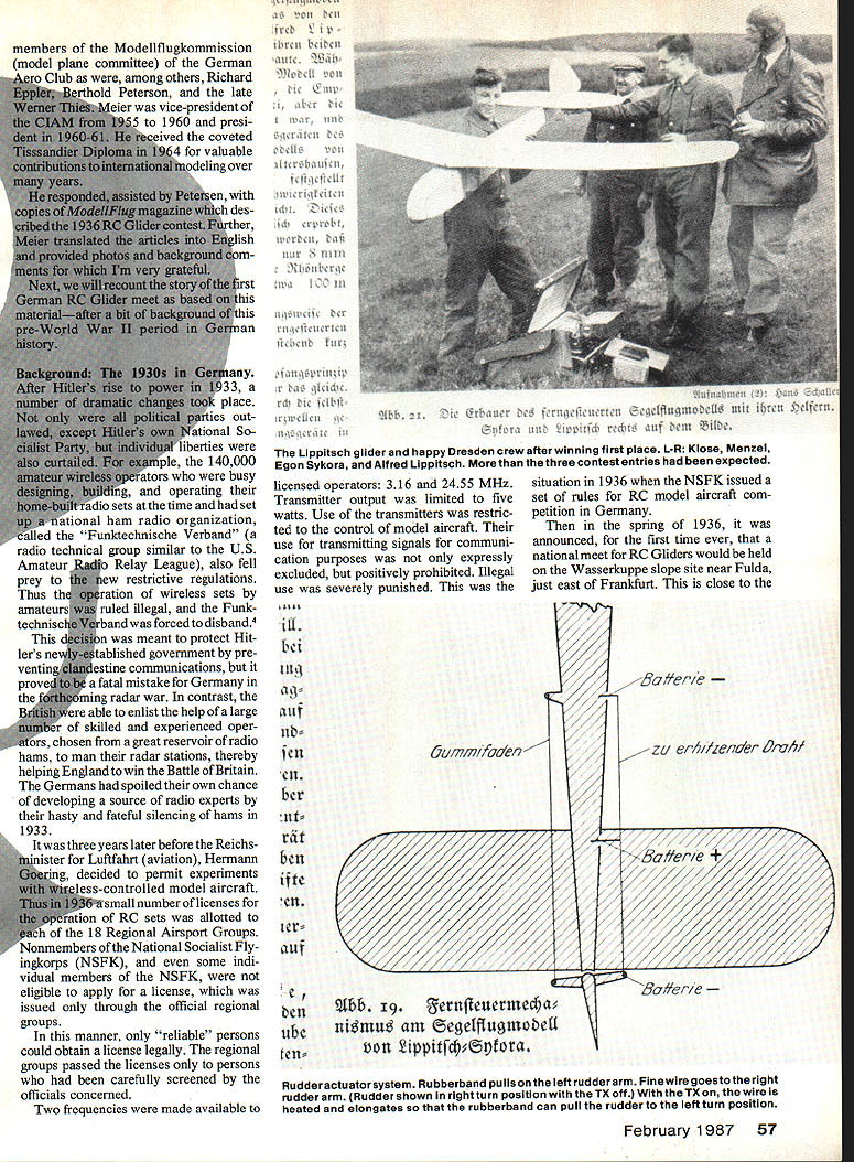 THIS STORY RELATES results chasing down early hobby RC flights well documented appears predate similar event USA may candidate first RC model flight world may earlier flights Im aware pekaps story will help pull out open RC History series Model via tion deliberately confined USA because personally involved gathered wealth historical material over early years Thus review RC activities other countries de layed until now well known inventions spring existence over world almost simultaneously necessary ingred ients available case ventions radio model tech niques enormity researching countrys RC history formidable task spite potential difficulties thought quest would interesting several years ago happened glancing through 1938 Model Air plane News read report Frank Zaic about visit Europe 1937 got started story2 report An American View German Model Aviation des cribed impressions German na tional meet Reichswettbewerb Borken bergen Westfalen August 1937 invited guest after attending Wake field event Europe earlier year Although report covered rubber- gas-powered Free Flight events sentence caught attention Special events brought out gas autogyro failed fly steam-turbine-powered model radio control also failed fly meet month after 1937 AMA Nats six RC entries USA wondered earlier RC events Germany Worlds time another distantly remo neiti having know other T reason placing tion mark EWalt Good Hans Justus M might have successful turned book received Werner Groth German Aero Club visit Germany 1 982 v history German model flying 25-year period 1951 1 covered Nats n quarter-century entries eJ Sure enough attended covere other caught eye w Gliders mid-1936 ayear earl first US RC Nats Right away queried longtim Bremen Hans Justus Meier met first ClAM meeting Europe 1958 ClAM FAIs C International Aero Modeling become well acquainted during years ClAM maintained contact over years active leader German model activities early postwar years founding title 56 Model Aviation tha. ventor same idea about same Lippitsch RC Glider model being launched atthe Wasserkuppe Germanyon June 11936 Lippitsch model won first place prize $8000 equivalent todays US dollars fly 3 place ics out nal SOwere ne 140000 aria operating o e time set Lional ham radio organization Funktechnische Verband radio technical group similar US Amateur lay League also fell prey restrictive regulations Thus th on wireless sets amateurs d illegal Funk technisc forced disband4 ant protect Hit lers ne ished government pre ventin estine communications prove fatal mistake Germany theming radar war contrast ere able enlist help large er skilled experienced oper ors chosen great reservoir radio hams man radar stations thereby helping England win Baffle Britain Germans spoiled own chance developing source radio experts hasty fateful silencing hams 1933 three years later before Reichs ister Luftfahrt aviation Hermarin ded permit experiments s-controlled model aircraft rsmall number licenses ion RC sets allotted 0f 18 Regional Airsport Groups Nonmembers National Socialist Fly ingkorps NSFK some indi vidual members NSFK eligible apply license issued through official regional groups manner reliable persons could obtain license legally regional groups passed licenses persons carefully screened officials concerned Two frequencies made available tll Uj ippitsch glider happy Dresden crew after winning first place L-R Kiose Menzel Egon Sykora Alfred Lippitach three contest entries expected licensed operators 316 2455 MHz Transmitter output limited five watts Use transmitters restric ted control model aircraft use transmitting signals communi cation purposes expressly excluded positively prohibited Illegal use severely punished iii hi XflT Pii hr rit bcn ijtc tcn 5&m/r//7de/r /7/7f 77/7 /7 // / 7 7 /7 / 7/ / 2Ibb 19ereucrme4& nimu 4m effiimobeU situation 1936 NSFK issued set rules RC model aircraft com petition Germany spring 1936 announced first time ever national meet RC Gliders would held Wasserkuppe slope site near Fulda just east Frankfurt close 7 Sc//erie ZLI ef/il/ZCPIAY DiM /7 /7 -Ba#ere / /7 7 77 / / / 7/ / / Sc//erie Rudder actuatorsystem Rubberband pulls left rudderarm Fine wire goesto right rudder arm Rudder shown rightturn position TX off TX wire heated elongates rubberband can pull rudder left turn position February 1987 57 members Modellflugkommission model plane committee German Club among others Richard hn14 Peterson late ier vice-president 1960 presi ived coveted valuable deling over lbt 2L C~ rtkfliI brnltn present border East Germany have visited famous site several times since 1965 found very active both fullscale RC Gliders As aside comment can recommend visit Wasserkuppe RC Glider flier will high point European vacation trip can stay site overnight cozy hotel called Peterchens Mondfahrt literally Little Peters Moon Ship has ex cellent restaurant Also rides two-place /powered gliders available affording overview beautiful Rhoen Valley glider slopes have faces wind direction Now back 1936 Especially attractive competitors event unusually large cash prize 1500 marks almost five months salary young graduate engineer Today equiv alent dollars old 1 SOOM would over $10000not bad contest entries Sunday May 31 1936 finally arrived three entries RC Glider competition rudder designs entries anticipated view licensing difficulty perhaps small num ber should have expected under stand least person did enter because license application turned down three entries 1 Alfred Lippitsch well-known modeler Dresden three-man team Egon Sykora elec trical engineering student two help ersKlose Menzel also well-known model fliers5 2 Helmut Sinn Gop pingen 3 Merkner-Rieger Walter shausen following descriptions taken 1936 issues Modeliflug magazine permission German pub lishers6 should mentioned models flown prior meet Helmut Sinns model rudder set left turn transmitter offthen small electric actuator would move rudder right Unfortunately although receiver actuator