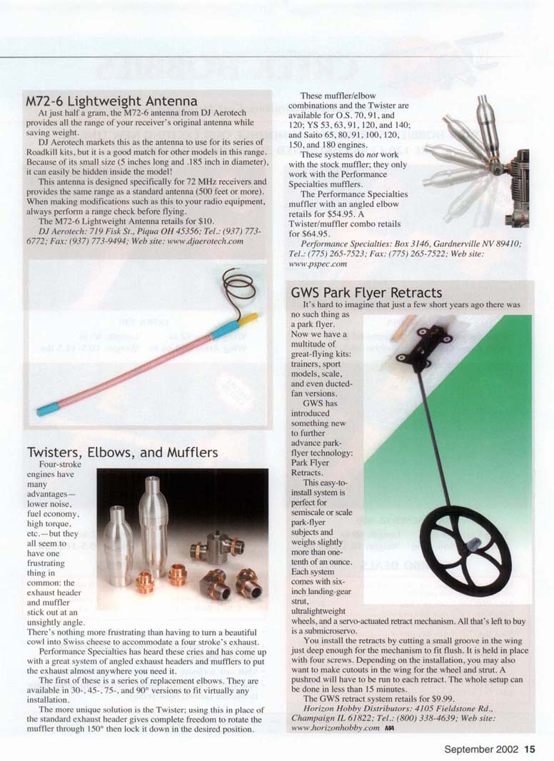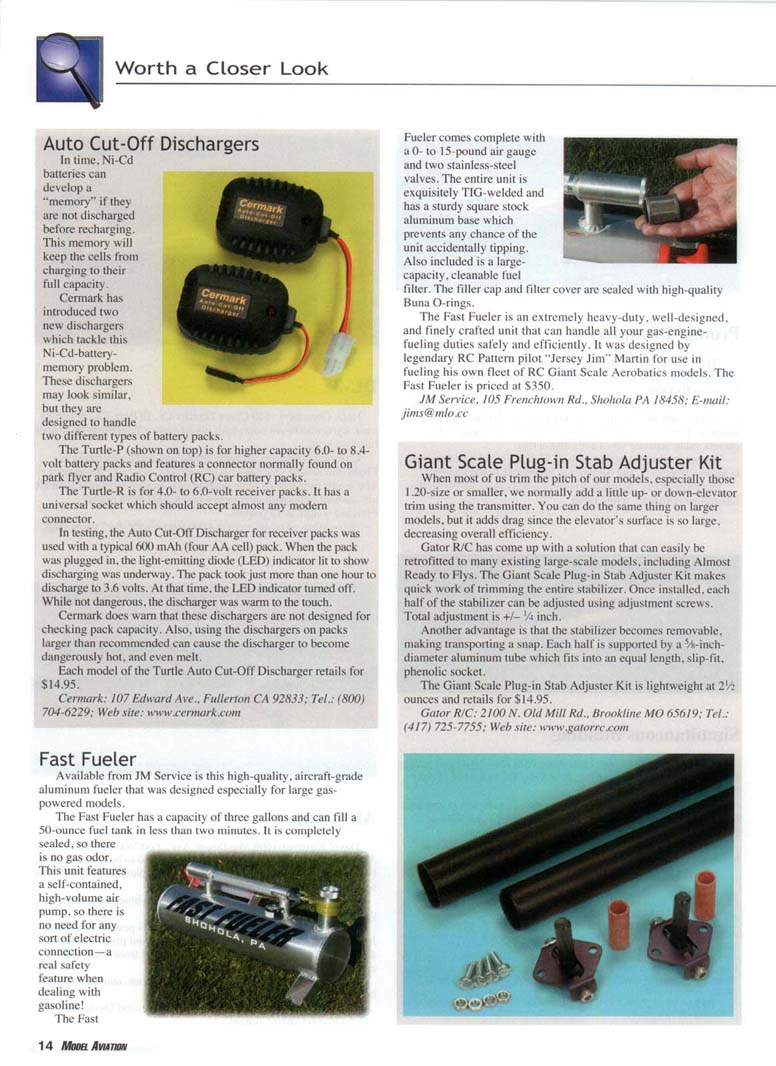 Auto Cut-Off Dischargers In time, Ni-Cd batteries can develop a "memory" if they are not discharged before recharging. This memory will keep the cells from charging to their full capacity. Cermark has introduced two new dischargers which tackle this Ni-Cd-battery-memory problem. These dischargers may look similar, but they are designed to handle two different types of battery packs. The Turtle-P (shown on top) is for higher capacity 6.0- to 8.4-volt battery packs and features a connector normally found on park flyer and Radio Control (RC) car battery packs. The Turtle-R is for 4.0- to 6.0-volt receiver packs. It has a universal socket which should accept almost any modern connector. In testing, the Auto Cut-Off Discharger for receiver packs was used with a typical 600 mAh (four AA cell) pack. When the pack was plugged in, the light-emitting diode (LED) indicator lit to show discharging was underway. The pack took just more than one hour to discharge to 3.6 volts. At that time, the LED indicator turned off. While not dangerous, the discharger was warm to the touch. Cermark does warn that these dischargers are not designed for checking pack capacity. Also, using the dischargers on packs larger than recommended can cause the discharger to become dangerously hot, and even melt. Each model of the Turtle Auto Cut-Off Discharger retails for $14.95. Cermark: 107 Edward Ave., Fullerton CA 92833; Tel.: (800) 704-6229; Web site: www.cermark.com Fast Fueler Available from JM Service is this high-quality, aircraft-grade aluminum fueler that was designed especially for large gas-powered models. The Fast Fueler has a capacity of three gallons and can fill a 50-ounce fuel tank in less than two minutes. It is completely sealed, so there is no gas odor. This unit features a self-contained, high-volume air pump, so there is no need for any sort of electric connection—a real safety feature when dealing with gasoline! The Fast Fueler comes complete with a 0- to 15-pound air gauge and two stainless-steel valves. The entire unit is exquisitely TIG-welded and has a sturdy square stock aluminum base which prevents any chance of the unit accidentally tipping. Also included is a large-capacity, cleanable fuel filter. The filler cap and filter cover are sealed with high-quality Buna O-rings. The Fast Fueler is an extremely heavy-duty, well-designed, and finely crafted unit that can handle all your gas-engine-fueling duties safely and efficiently. It was designed by legendary RC Pattern pilot "Jersey Jim" Martin for use in fueling his own fleet of RC Giant Scale Aerobatics models. The Fast Fueler is priced at $350. JM Service, 105 Frenchtown Rd., Shohola PA 18458; E-mail: jims@mlo.cc Giant Scale Plug-in Stab Adjuster Kit When most of us trim the pitch of our models, especially those 1.20-size or smaller, we normally add a little up- or down-elevator trim using the transmitter. You can do the same thing on larger models, but it adds drag since the elevator's surface is so large, decreasing overall efficiency. Gator R/C has come up with a solution that can easily be retrofitted to many existing large-scale models, including Almost Ready to Flys. The Giant Scale Plug-in Stab Adjuster Kit makes quick work of trimming the entire stabilizer. Once installed, each half of the stabilizer can be adjusted using adjustment screws. Total adjustment is +/- !/4 inch. Another advantage is that the stabilizer becomes removable, making transporting a snap. Each half is supported by a V«-inch-diameter aluminum tube which fits into an equal length, slip-fit, phenolic socket. The Giant Scale Plug-in Stab Adjuster Kit is lightweight at 2'/2 ounces and retails for $14.95. Gator R/C: 2100 N. Old Mill Rd., Brookline MO 65619; Tel.: (417) 725-7755; Web site: www.gatorrc.com 14 MooaAiMjw M72-6 Lightweight Antenna At just half a gram, the M72-6 antenna from DJ Aerotech provides all the range of your receiver's original antenna while saving weight. DJ Aerotech markets this as the antenna to use for its series of Roadkill kits, but it is a good match for other models in this range. Because of its small size (5 inches long and .185 inch in diameter), it can easily be hidden inside the model! This antenna is designed specifically for 72 MHz receivers and provides the same range as a standard antenna (500 feet or more). When making modifications such as this to your radio equipment, always perform a range check before flying. The M72-6 Lightweight Antenna retails for $10. DJ Aerotech: 719 Fisk St., Piqua OH 45356; Tel.: (937) 773-6772; Fax: (937) 773-9494; Web site: www.djaerotech.com r Twisters, Elbows, and Mufflers Four-stroke engines have many advantages— lower noise, fuel economy, high torque, etc.—but they all seem to have one frustrating thing in common: the exhaust header and muffler stick out at an unsightly angle. There's nothing more frustrating than having to turn a beautiful cowl into Swiss cheese to accommodate a four stroke's exhaust. Performance Specialties has heard these cries and has come up with a great system of angled exhaust headers and mufflers to put the exhaust almost anywhere you need it. The first of these is a series of replacement elbows. They are available in 30-, 45-, 75-. and 90° versions to fit virtually any installation. The more unique solution is the Twister; using this in place of the standard exhaust header gives complete freedom to rotate the muffler through 150° then lock it down in the desired position. These muffler/elbow combinations and the Twister are availableforO.S.70,91,and 120; YS 53. 63,91, 120, and 140; andSaito65,80,91, 100, 120, 150, and 180 engines. These systems do not work with the stock muffler; they only work with the Performance Specialties mufflers. The Performance Specialties muffler with an angled elbow retails for $54.95. A Twister/muffler combo retails for $64.95. Performance Specialties: Box 3146, Gardnerville NV 89410; Tel.: (775) 265-7523; Fax: (775) 265-7522; Web site: www