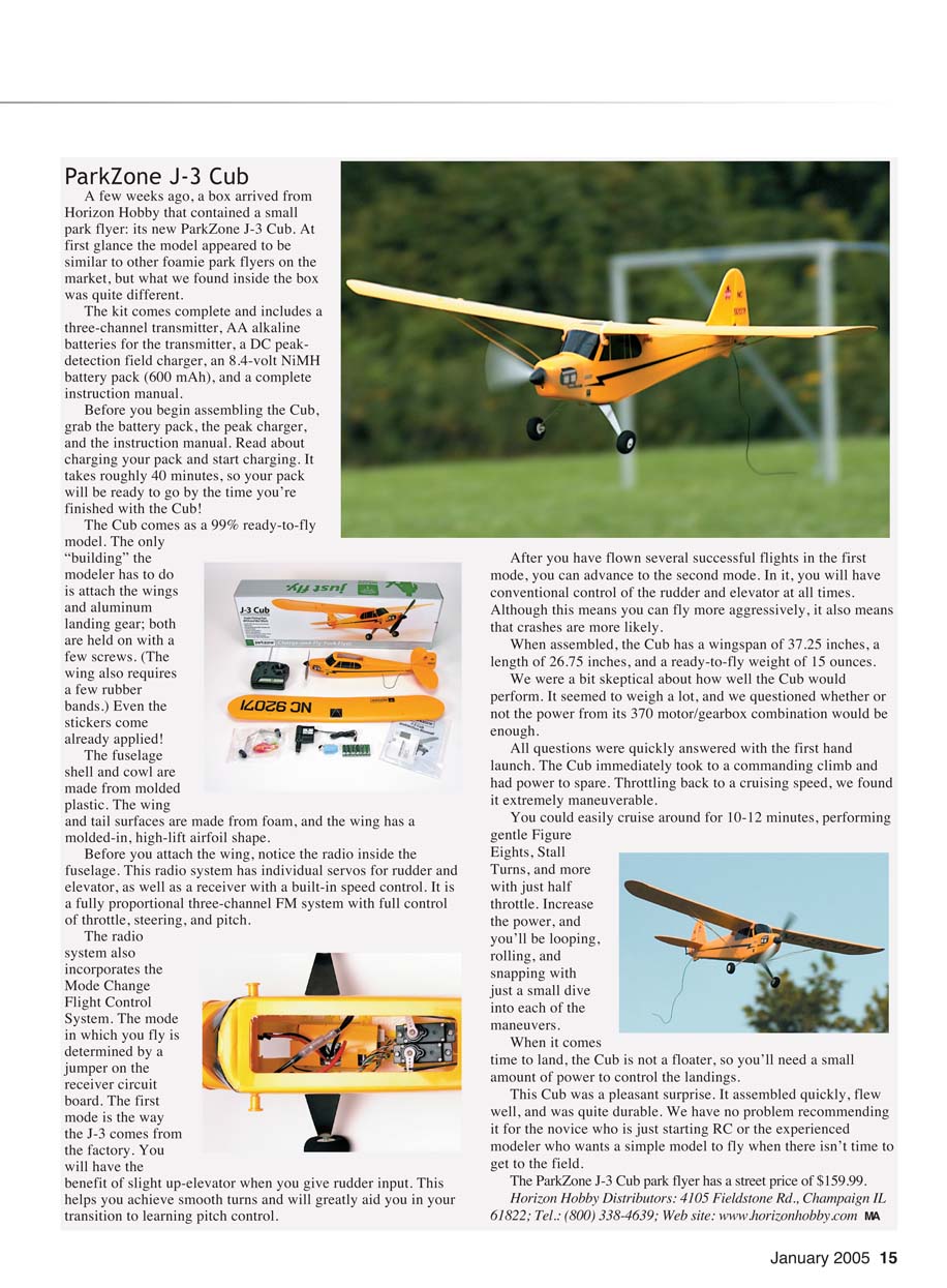 The ParkZone J-3 Cub park flyer has a street price of $159.99.