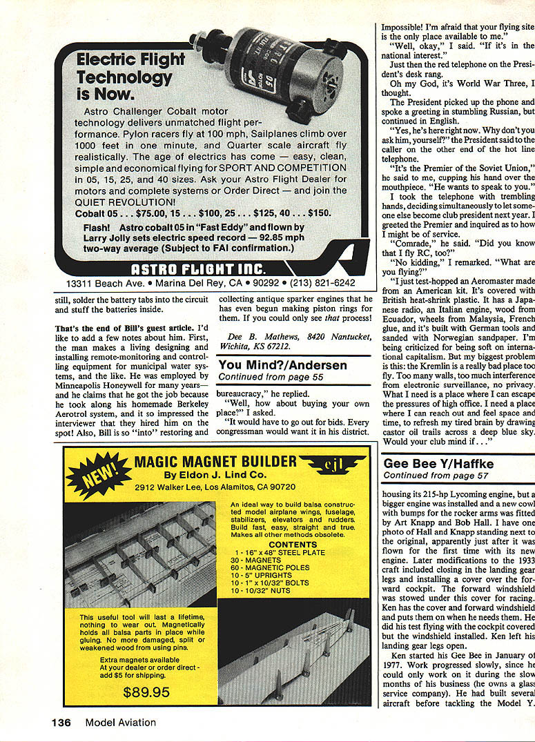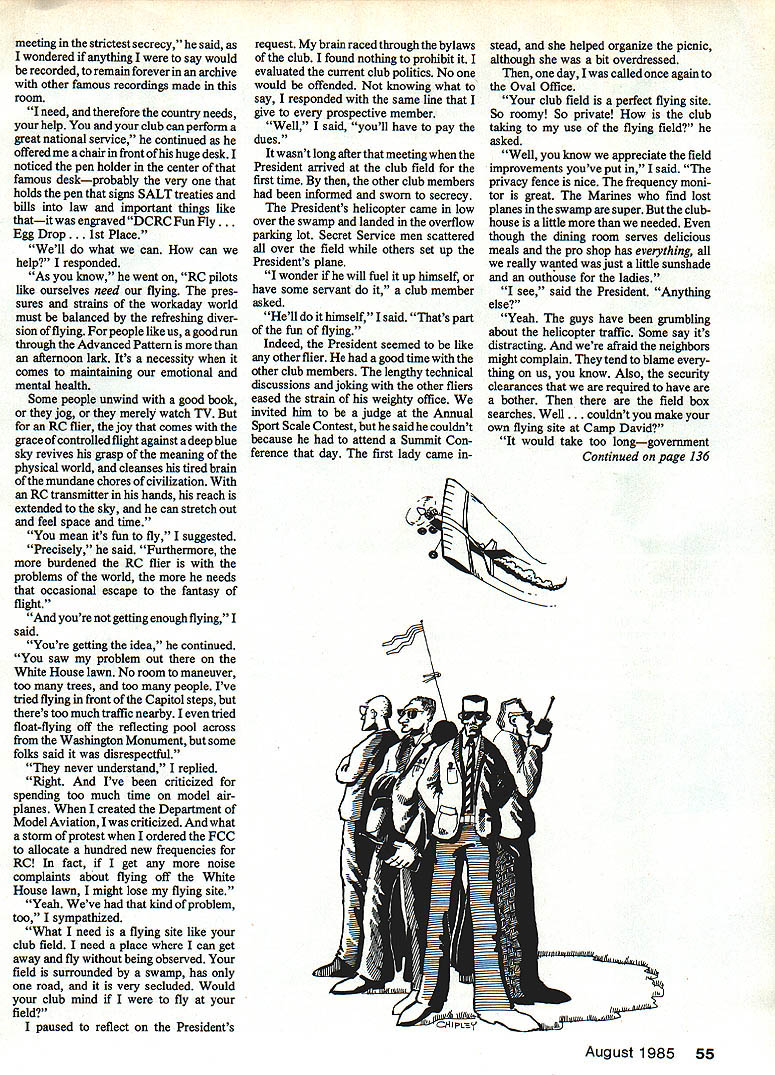 WEI4 TO W~ C CLUB / K -/ U HJPLy EKKJWouId Club Mind If. THE SIGNS OF SECURITY every- wouldnt want flying closely offered transmitter Washington day air traffic scrutinized time like Presidents looked around horde reporters routed away city streets must movie TV cameras Flash blocked near vicinity White Having little common bulbs popping like crazy around House sign Pennsylvania Ave President curious about spite bright sunlight said No Vans Pickups Beyond asked come White House Other course said Id rather Point fact both fly RC fly attention focused waited south portico White experience share lam also either said Thats House along representatives president Imjustpresident RC asked Lets go office press lobbyists foreign dignitaries model airplane club Ill tell what mean searched sky get glimpse ushered forward President As walked White House the Presidents plane introduced President sprayed hands bottle Suddenly appeared above pines Im glad meet said Fantastik wiped paper decorated periphery famous offering hand towel As entered Oval Office residencea gleaming red white blue shook recognized slippery feel noticed couple chips balsa wood airplane letters spelling castor oil carpet United States America fuselage fly mode asked must ask keep details flew wide sweeping turn over city began its descent Clear landing area Presidents plane about land voice loudspeaker shouted across expanse south lawn White House Report ers officials scurried off grass Presidents plane leveled its wings began its final approach lowering its landing gear descending steeply noted although White House lawn large itwas just barely big enough landing field plane slowed began flare touched down rolled stop spectators cheered little RC airplane taxied up Presidents field box propeller stopped turning Egad its like flying air show time goes up thought little mistake would go unnoticed loops drifted downwind Paul Harvey would crit icize forgot clip pin antenna Jack Anderson would report crashed stock market would plummet too wouldnt care Flying couple contests year pease other peoples criteria fun challenge time Id rather fly please myselfjust bore few holes sky HA short story D P Andersen 54 Model Aviation meeting strictest secrecy said wondered anything say would recorded remain forever archive other famous recordings made room need therefore country needs help club can perform great national service continued offered chair front huge desk noticed pen holder center famous deskprobably very holds pen signs SALT treaties bills law important things like thatit engraved DCRC Fun Fly. Egg Drop. 1st Place Well what can can help responded As know went RC pilots like ourselves need flying pres sures strains workaday world must balanced refreshing diver sion flying people like us good run through Advanced Pattern afternoon lark Its necessity comes maintaining emotional mental health Some people unwind good book jog merely watch TV RC flier joy comes grace controlled flight against deep blue sky revives grasp meaning physical world cleanses tired brain mundane chores civilization RC transmitter hands reach extended sky can stretch out feel space time mean its fun fly suggested Precisely said Furthermore burdened RC flier problems world needs occasional escape fantasy flight youre getting enough flying said Youre getting idea continued saw problem out White House lawn No room maneuver too trees too people Ive tried flying front Capitol steps theres too much traffic nearby tried float-flying off reflecting pool across Washington Monument some folks said disrespectful never understand replied Right Ive criticized spending too much time model air planes created Department Model Aviation criticized what storm protest ordered FCC allocate hundred new frequencies RC fact get noise complaints about flying off White House lawn might lose flying site Yeah Weve kind problem too sympathized What need flying site like club field need place can get away fly being observed field surrounded swamp has road very secluded Would club mind fly field paused reflect Presidents request brain raced through bylaws club found nothing prohibit evaluated current club politics No would offended knowing what say responded same line give prospective member Well said youll have pay dues wasnt long after meeting President arrived club field first time other club members informed sworn secrecy Presidents helicopter came low over swamp landed overflow parking lot Secret Service men scattered over field others set up Presidents plane wonder will fuel up himself have some servant club member asked Hell himself said Thats part fun flying Indeed President seemed like other flier good time other club members lengthy technical discussions joking other fliers eased strain weighty office invited him judge Annual Sport Scale Contest saidhe couldnt because attend Summit Con ference day first lady came instead helped organize picnic although bit overdressed day called once again Oval Office club field perfect flying site So roomy So private club taking use flying field asked Well know appreciate field improvements youve put said privacy fence nice frequency moni tor great Marines find lost planes swamp super club house little needed though dining room serves delicious meals pro shop has everything really wanted just little sunshade outhouse ladies see said President Anything else Yeah guys have grumbling about helicopter traffic Some say its distracting afraid neighbors might complain tend blame thing us know Also security clearances required have bother field box searches Well. couldnt make own flying site Camp David would take too longgovernment Continued page 136 UlI August 1985 55 I, still solder battery tabs circuit stuff batteries inside Thats end Bills guest article Id like add few notes about him First man makes living designing installing remote-monitoring control ling equipment municipal water sys tems like employed Minneapolis Honeywell years claims got job becaus
