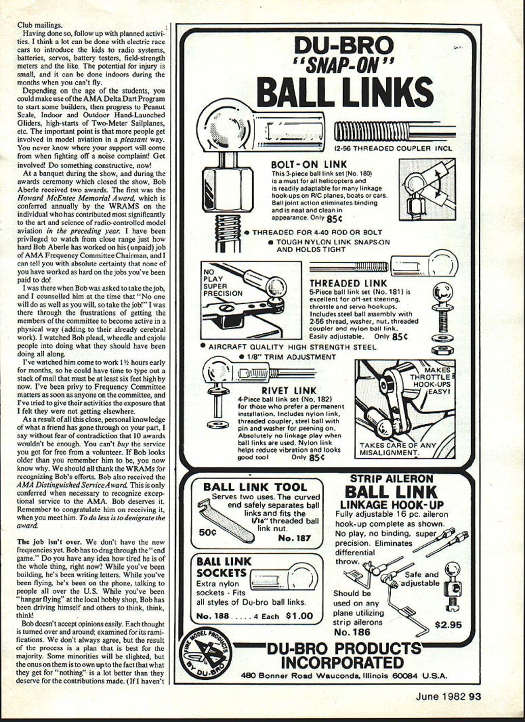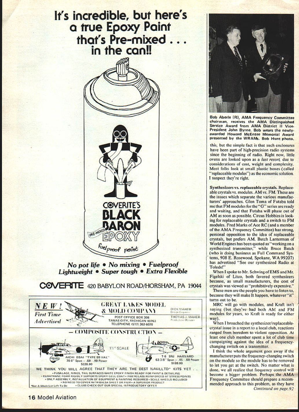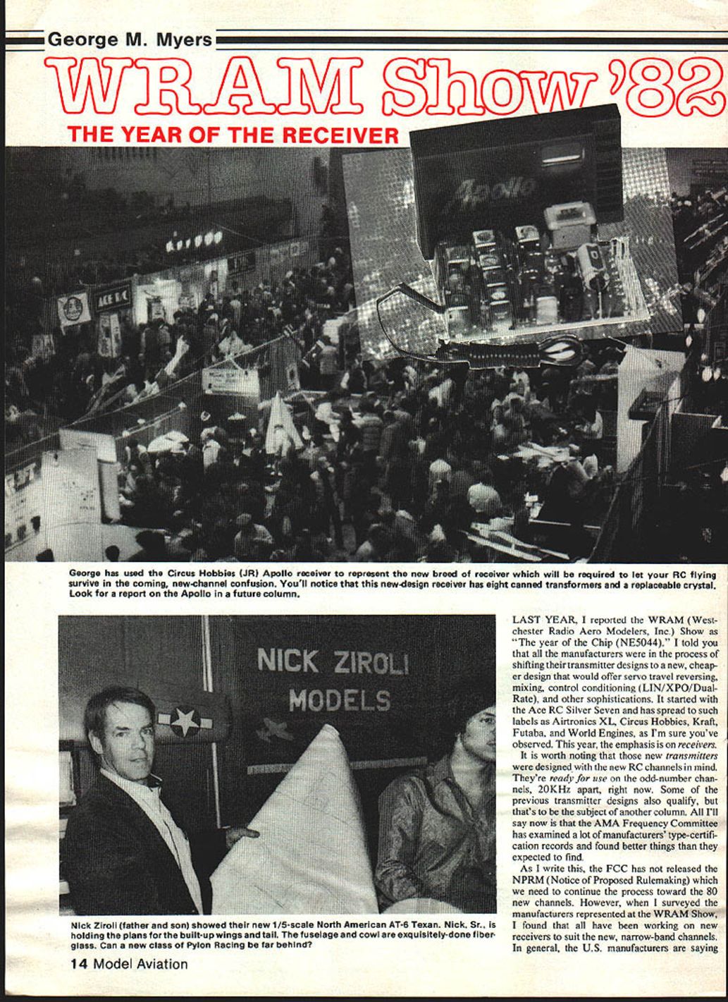 George M Myer KV7 0 95 LAST YEAR reported WRAM West chester Radio Aero Modelers Inc Show year Chip NE5044 told manufacturers process shifting transmitter designs new cheap er design would offer servo travel reversing mixing control conditioning LIN/XPO/Dual Rate other sophistications started Ace RC Silver Seven has spread such labels Airtronics XL Circus Hobbies Kraft Futaba World Engines Im sure youve observed year emphasis receivers worth noting new transmitters designed new RC channels mind Theyre ready use odd-number chan nels 20KHz apart right now Some previous transmitter designs also qualify thats subject another column Ill say now AMA Frequency Committee has examined lot manufacturers type-certifi cation records found better things expected find As write FCC has released NPRM Notice Proposed Rulemaking need continue process toward 80 new channels However surveyed manufacturers represented WRAM Show found have working new receivers suit new narrow-band channels general US manufacturers saying 14 Model Aviation George has used Circus Hobbies JR Apollo receiver reprasent new breed receiver will required let RC flying survive coming new-channel confusion Voull notice new-design receiver has eight canned transformers replaceable crystal Look report Apollo future column Nick Ziroli father son showed new 1/5-scale North American AT-6 Texan Nick Sr holding plans built-up wings tail fuselage cowl exquisitely-done fiber glass Can new class Pylon Racing far behind working Japanese manu facturers saying ready sell soon R&O Report Order takes effect exactly what expected find because Japanese have selling narrow-band equipment European market years no consensus Some manufacturers talk replaceable crystals others speak replaceable modules synthesize appropriate frequencies Both use crystals synthesizer uses common crystal channels replaceable-crystal design needs separate crystal pair trans mitter receiver channel replaceable-crystal approach has two sig nificant drawbacks 1 An inventory crystal pairs 80 different channels exceedingly expensive some say prohibitively expensive 2 The crystal manufacturers dont want set up production lines get small number crystals hobby will need second quibble reflects thing wrong world today. trend toward supra-National Super-Corporations size prohibits taking small jobs progress stifled favor continuous produc tion obsolete common designs Have noticed perhaps hard tell auto mobile another regardless country origin J.ets get back receivers fundamental issue new receiver bandwidth Existing receiver designs cant tuned well enough survive narrow-band environment other hand achieve narrow-band performance have worry about stability narrow-band system has proportionally less room accept transmitter frequency drifting way receiver tuning drifts other solution problem voltage regulation Im sure have observed NE5044 NE5 045 receiver chips feature voltage regulation ever voltage regulation isnt need Drift also caused temperature changes narrow-band system also requires tempera ture compensation general means higher-quality expensive components must used may also necessary put crystals other frequency-determining com ponents inside little insulated heated enclo sures Everyone shudders suggest continued page 16 June 198215 Rich Urevichs new 15-powered AT-6 Texan designed specifically Pylon Racing con struction article model appeared May1982 edition ModelAirplane News George reports several area modelers already have birds flying preparation inaugural series Pylon Races design will held July 1982 Further details race schedule rules obtainable Rich MAN offices Charlie Cannon petite tail appreciate fact Pattern plane holding belongs hubby Bill powered G-Mark 03 engine Yep thats little halfthesizeofanormalAplane Naturally uses 4-ch Cannon Micro radio Kraft showing neir new lTorelgn-ouiIti -4 servo eorge nas tested ne pro nounces good amplifier doesnt care what frame-rate yourtransmitter uses wide variety output devices provided fit its splined output shafta departure Krafts usual snuare outnut shaft AMA District II meeting John Byrne District II Vice-President listens attentively member asks question about - s what osed new RC frequencies Its incredible heres true Epoxy Point thats Pre-mixed. can! 0O 9 q ERITES BLACK PAQRON IPAO p8Iflt No pot life ixing proof Lightweight r tough a Flexible C0VERITE 420 BABYLON ROAD/HORSHAM PA 19044 & 11011 %11IA\Y D[CKMAHFR First TimePOST OFFICE BOX 308THOMASJ MAHER tit trIjs(ITAPJAS CITY MICHIGAN 48763 PHONE 517 362-6078 011 PSITE OWIIIL4 TI CALE CH 03ATYPE B9VAL 70 5 Span60 90 Po 5228 00 WE THINK YOU WILL AGREE THAT THEY ARE THE nEST NAWLLTD0 KITS YET FUSALAGE WINGS TAIL SURFACES WHITE EPOXY FINISH READY FOR PAINT & OFTAILING EURATHANE FOAM RIGIDLY SUPPORTS EPOXY GELL COAT FIBERGLASS REINFORCED AT STRESS POINTS ONLY ASSFMBLY INSTALLATION OF EOUIPMENT & PAINTING REGUIRED SCALE WHEELS INCLUDED NO NEED TO COVER WITH BALSA SHEET OR FILM SUPERIOR PRODUCT NO Whole Loe LeO CLUBS CHECK OUT OUR SPECIAL INTRODUCTORY OFFER SNJ HARVARD U63 3/8 Span 0 Power Si 8800 Simple fact such enclosures have part high-precision radio systems since beginning radio Right now little ovens looked upon last resorl due considerations cost weight complexity Most folks look small plastic boxes called replaceable modules economic solution suspect theyre right Synthesizers vs replaceable crystals Replace able crystals vs modules AM vs FM issues separate various manufac turers approaches Glen Toma Futaba told FM modules G series ready waiting Futaba will phase out AM soon possible Circus Hobbies look ing replaceable crystals switch FM modules Fred Marks Ace RC member AMA Frequency Committee has strong personal opposition idea replaceable crystals prefers AM Butch Lanterman World Engines has quoted working synthesized transmitter Bruce Batch doing business Full Command Sys tems 908 E Rosewood Spokane WA 99207 has advertised See synthesized Radio Toledo spoke Mr Schwing EMS 