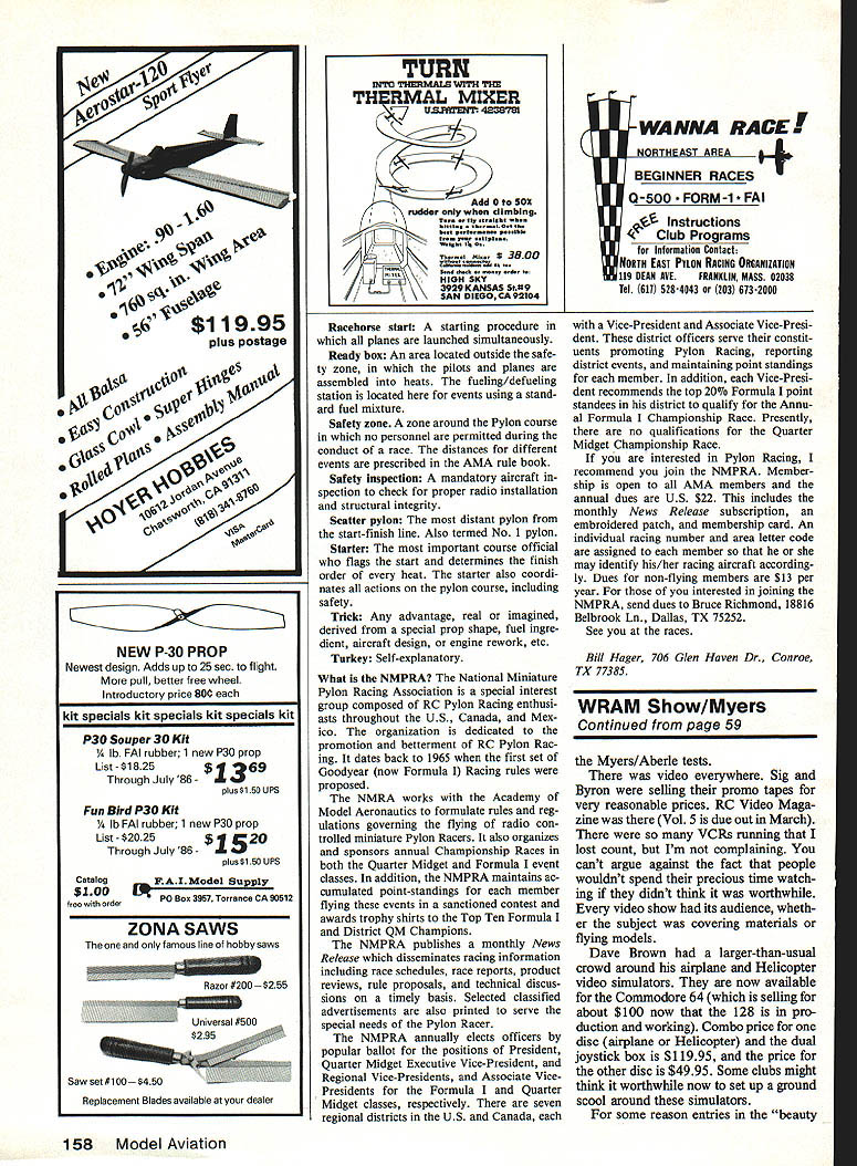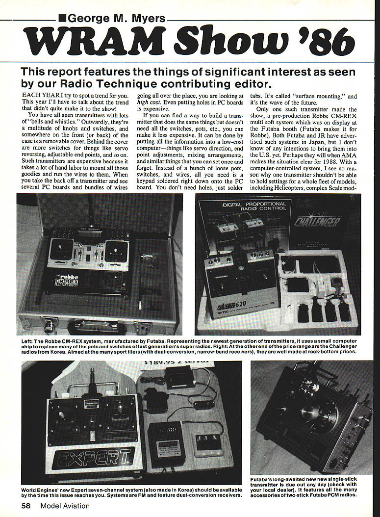 EGeorge M Myers WHAM Show 86 report features things significant interest seen Radio Technique contributing editor EACH YEAR try spot trend year Ill have talk about trend didnt quite make show have seen transmitters lots bells whistles Outwardly theyre multitude knobs switches somewhere front back case removable cover Behind cover switches things like servo reversing adjustable end points Such transmitters expensive because takes lot hand labor mount goodies run wires take back off transmitter see several PC boards bundles wires going over place looking high cost putting holes PC boards expensive can find way build trans mitter does same things doesnt need switches pots etc can make less expensive can done putting information low-cost computerthings like servo direction end point adjustments mixing arrangements similar things can set once forget Instead bunch loose pots switches wires need keypad soldered right down onto PC board dont need holes just solder tabs Its called surface mounting its wave future Only such transmitter made show pre-production Robbe CM-REX multi soft system display Futaba booth Futaba makes Robbe Both Futaba JR have adver tised such systems Japan dont know intentions bring US yet Perhaps will AMA makes situation clear 1988 computer-controlled system see no rea son transmitter shouldnt able hold settings whole fleet models including Helicopters complex Scale modLeft Robbe CM-REX system manufactured Futaba Representing newest generation transmitters uses small computer chip replace pots switches last generations super radios Right other end price range Challenger radios Korea Aimed sport fliers dual-conversion narrow-band receivers well made rock-bottom prices World Engines new Expert seven-channel system also made Korea should available time issue reaches Systems FM feature dual-conversion receivers Futabas long-awaited new new single-stick transmitter due out day check local dealer features accessories two-stick Futaba PCM radios 58 Model Aviation els simple two-channel Sailpianes what have Leaving crystal ball aside what did really see way new RC systems new offering aircraft Aristocrafts Challenger series offered Polks Hobbies various prices config urations ranging two-channel dry battery set $50 complete Ni-Cd Challenger 620 six-channel four-servo package Challenger 620 conventional design six-channel FM radio reversing switches channels two switch-selec ted mixing schemes accesso ries features dual-conversion narrowband receiver transmitter makes RC channel changes way plug-in mod ule back receiver changed swapping precision crystals make sure dont mix manu facturers crystals definitely alike Made Korea price nice feel good $9 servos have 42 oz output adequate applications can buy four Challengers price sophisiticated systems wasnt literature available new World Engines Expert system assured matches advertis ing seen few months ago 100 units have shipped dealers over US also seven-channel dual conversion narrowband Korea Korean TV has worked fine years Futaba showed PCM single-stick transmitter now four six weeks delivery saw mock-up WRAM Show last year know some single-stick fliers have very impatient get finished prod ucts Futaba PCM features known repackaged single-stick format Both Steve Helms Ivan Kristensen pointed out get half hours safe flying PCM transmitter Futaba still uses its single-conversion narrowband PCM re ceiver Rll8GP $179 FP T8SSA-P system price four S-130 servos $89995 MRC showing Simprop PCM 20 reported last year uses high-quality dual-conversion narrowband receiver transmitter features tray modules type flying want fly plane slide airplane module tray bottom transmitter Likewise boats cars Heli copters Sailplanes really get module concept initial cost can apportioned different uses doesnt look bad price high quality Hanno Prettner has done right Simprop radios Beemer RC West showed Multiplex radio another top quality system narrowband dual-conversion receiver Multiplex reconfigures transmitter little plug-in PROMS calls soft modules software modeulesjust step away what talking about head article Neither Multiplex nor Simprop new both scored best tests Bob Aberle conducted last year Both standards other European radios judged high standards indeed Also MRC booth new Acoms wheel radio unit has adjust able everything $150 available 75 MHz channels Mar keting system way helps keep uses 75 MHz 72 MHz channels separate required law should thank MRC well other manufacturers vendors help us way relatively lowpriced Acoms radios scored very high Continued page 158 June1986 59 Dave Browns RC Flight Simulator program now available both Tixed-wing rotat ing-wing versions inexpensive Commodore 64 its newer big brother 128 Bob Fiorenze took best-of-show flying models categorywith thesetwo Immaculate versions Nats-winning F4J Phantom latest fine folks Strobe-F-Light Audio Direction inaer looks loss signal receiver sounds buzzer help find lost airplane Its also great way determine another radio frequency turned g 11995 plus postage l~bV 4 Racehorse start starting procedure planes launched simultaneously Ready box An area located outside safe ty zone pilots planes assembled heats fueling/defueling station located events using stand ard fuel mixture Safety zone zone around Pylon course no personnel permitted during conduct race distances different events prescribed AMA rule book Safety inspection mandatory aircraft spection check proper radio installation structural integrity Scatter pylon distant pylon start-finish line Also termed No 1 pylon Starter important course official flags start determines finish order heat starter also coordi nates actions pylon course including safety Trick Any advantage real imagined derived special prop shape fuel ingre dient aircraft design engine rework etc Turkey Self-explanatory What NMPRA National Miniature Pylon Racing Association special interest group composed RC Pylon Racing enthusi asts throughout US Canada Mex ic