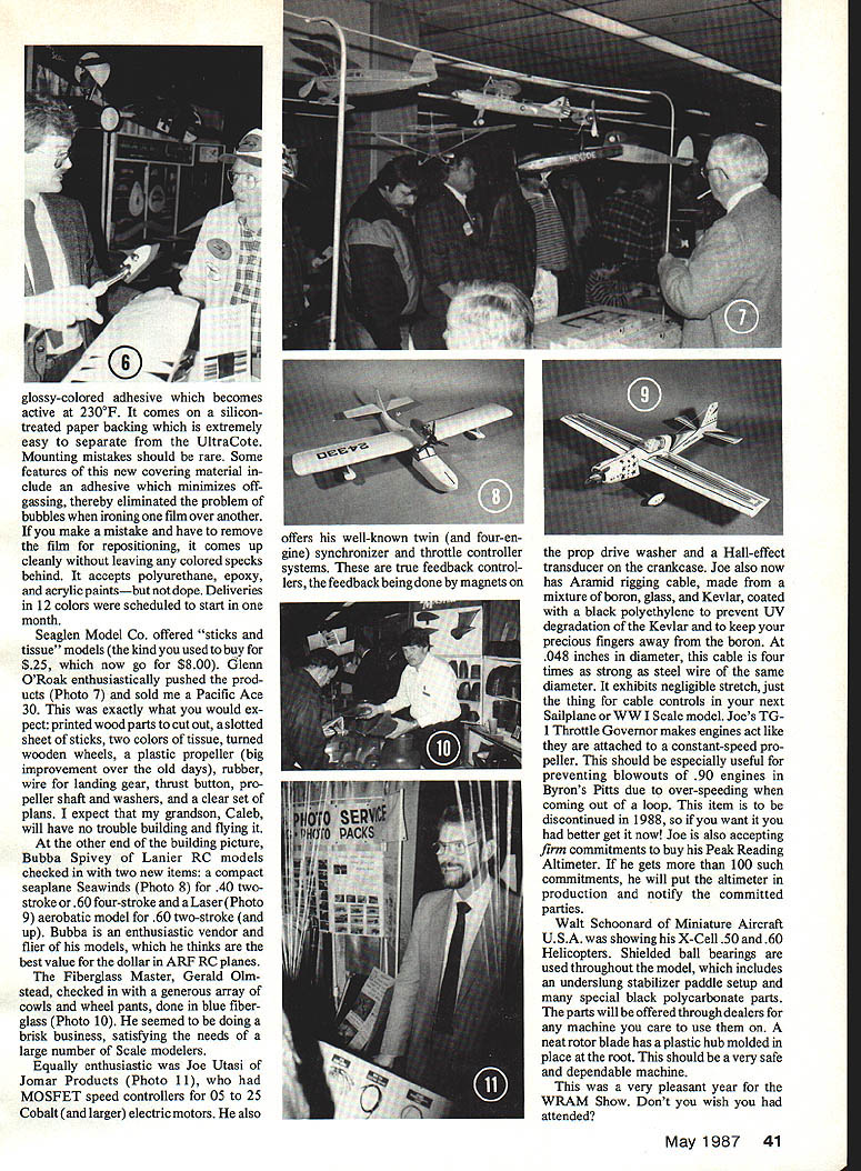 EGeorge M Myers FEBRUARY 21 22 beautiful warm sunny days heavy snowstorm held off till Sunday night predicted year WRAM Show moved Yonkers Race Track provided much better parking modem facilities ability have everything level As am somewhat restricted movements year due fact am re covering illness really appre ciated change usual three-floor setup other hand years ar rangement put three rows booths end containing Byron Onginals Ace RC AMA booth food concession created some choke points rest show booths two across fine Taking whole show consideration have agree layout much improved seemed people visited display models usually visit White Plains Civic Center lot trouble getting position photo graph models some beauties photograph Bob Fiorenze F- 18 Hornet looks like another winner Nats big crowd sur rounded Joe Saittas metal-clad 13-footspan B-i 7 impressive F-15 PBY Catalina looked like sure winners didnt have contend B-17 Photo 1 gives look third airplanes Photo 2 shows Helicopter lineup new RC system displayed view Cannon booth tiny new narrow-band six-channel receiver display Cannon Micro System seen right Photo 3 top bottom see micro receiver its plastic case naked receiver ball-point pen size comparison 75 mAh battery pack features battery charging jack mounted switch Cannon micro servo center Cannon Mini System mini receiver uses same circuit micro constructed larger pre sumably less expensive components transmitter shown common both sys tems now includes servo reversing under back cover safe inquisitive fingers new controls available outside case dualrate switch throttle end-point ad justment via hole back cover left Charlies radio shares forgoing adds seventh channel Shipments will start couple months whim slowest parts vendor Bill quoted leadtimes 26 months some special items believe him because face lead times quoted years some Grummans aircraft space craft components subject radios should take look AMAs Gold Star transmitter checkout Photo 4 taken over shoulder Fred Marks years recipient McEntee Medal Bill Hershberger George P Steiner also Frequency Committee members swamped transmitters test year Sometimes success hard take Electric-powered models getting more support trade Photo 5 shows new line folding propellers K&W Enterprises Derived folders previously built FAI models line extends 7D x 2P 13D x 7P dimensions inches hubs alumi num present soon will filled polycarbonate plastic blades made continuous-filament fiberglass rein forcing epoxy resin Distribution will handled Sonic-Tromcs Warren Kronberger explains features new Carl Goldberg UltraCote ironon covering material Photo 6 Mattefinish polyethylene film coated AO Model Aviation glossy-colored adhesive becomes active 2300F comes silicontreated paper backing extremely easy separate UltraCote Mounting mistakes should rare Some features new covering material dude adhesive minimizes offgassing thereby eliminated problem bubbles ironing film over another make mistake have remove film repositioning comes up cleanly leaving colored specks behind accepts polyurethane epoxy acrylic paintsbut dope Deliveries 12 colors scheduled start month Seaglen Model Co offered sticks tissue models kind used buy $25 now go $800 Glenn ORoak enthusiastically pushed prod ucts Photo 7 sold Pacific Ace 30 exactly what would ex pect printed wood parts cutout slotted sheet sticks two colors tissue turned wooden wheels plastic propeller big improvement over old days rubber wire landing gear thrust button pro peller shaft washers clear set plans expect grandson Caleb will have no trouble building flying other end building picture Bubba Spivey Lanier RC models checked two new items compact seaplane Seawinds Photo 8 40 twostroke 60 four-stroke Laser Photo 9 aerobatic model 60 two-stroke up Bubba enthusiastic vendor flier models thinks best value dollar ARF RC planes Fiberglass Master Gerald Olinstead checked generous array cowls wheel pants done blue fiber glass Photo 10 seemed doing brisk business satisfying needs large number Scale modelers Equally enthusiastic Joe Utasi Jomar Products Photo 11 MOSFET speed controllers 05 25 Cobalt larger electric motors also prop drive washer Hall-effect transducer crankcase Joe also now has Aramid rigging cable made mixture boron glass Kevlar coated black polyethylene prevent UV degradation Kevlar keep precious fingers away boron 048 inches diameter cable four times strong steel wire same diameter exhibits negligible stretch just thing cable controls next Sailplane WW Scale model Joes TG 1 Throttle Governor makes engines act like attached constant-speed pro peller should especially useful preventing blowouts 90 engines Byrons Pitts due over-speeding coming out loop item discontinued 1988 want better get now Joe also accepting firm commitments buy Peak Reading Altimeter gets 100 such commitments will put altimeter production notify committed parties Walt Schoonard Miniature Aircraft USA showing X-Cell 50 60 Helicopters Shielded ball bearings used throughout model includes underslung stabilizer paddle setup special black polycarbonate parts parts will offered through dealers machine care use neat rotor blade has plastic hub molded place root should very safe dependable machine very pleasant year WRAM Show Dont wish attended May1987 41 offers well-known twin four-en gine synchronizer throttle controller systems true feedback control lers feedback being done magnets on