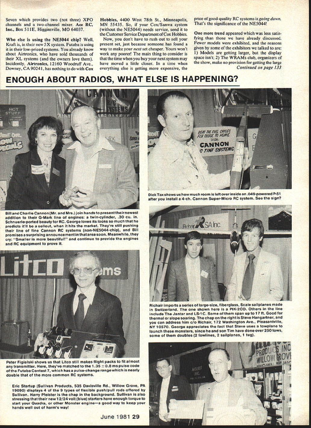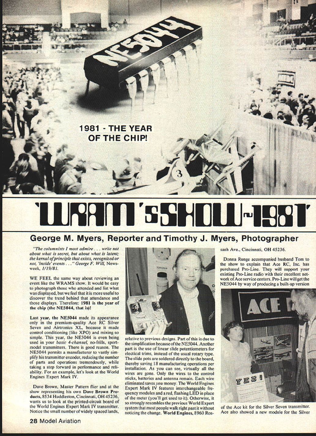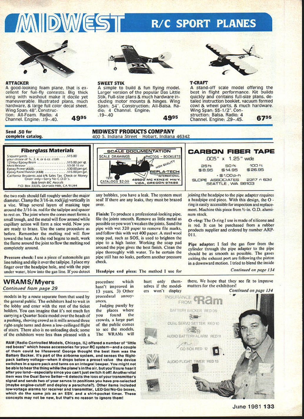 George M Myers Reporter Timothy J Myers Photographer columnists admire te about what secret about what latent kernal ofprinciple exists recognized inside events orge F Will News week 1/19/81 WE FEEL same way about reviewing event like WRAMS show would easy photograph attended list what displayed feel useful discover trend behind attendance displays Therefore 1981 year chip NE5044 Last year NE5044 made its appearance premium-quality Ace RC Silver Seven Airtronics XL because made control conditioning like XPO mixing simple year NE5044 being used basic 4-channel no-frills sportmodel transmitters good reason NE5044 permits manufacturer vastly sim plify transmitter encoder reducing number parts operations tremendously taking step forward performance reli ability example lets look World Engines Expert Mark IV Dave Brown Master Pattern flier show representing own Dave Brown Pro ducts 8534 Huddleston Cincinnati OH 45236 wants us look printed-circuit board World Engines Expert Mark IV transmitter Notice small number widely spaced lands / relative previous designs Part due simplification because NE5044 Another part use linear slide potentiometers electical trims instead usual rotary type slide pots soldered directly board thereby saving 1 8 manufacturing operations per installation As can see virtually wires gone Only wires control sticks batteries antenna remain wire eliminated saves money World Engines Expert Mark IV features interchangeable fre quency modules red flashing LED place meter youll get used Otherwise strongly resembles previous World Expert system people walk right past noticing change World Engines 8960 Ros sash Ave Cincinnati OH 45236 Donna Runge accompanied husband Tom show explain Ace RC Inc has purchased Pro-Line will support existing Pro-Line radio excellent net work Ace service centers Pro-Line will get NES 044 way nroducina built-un version Ace kit Silver Seven transmitter Ace also showed new module Silver 28 Model Aviation Seven provides two three XPO channels two-channel mixer Ace RC Inc Box 5 liE Higginsville MO 64037 else using NE5044 chip Well Kraft new 5X system Futaba using low-priced systems already know about Airtronics have sold thousands XL systems owners love Incidently Airtronics 12160 Woodruff Ave Downey CA 90241 hasnothingtodowithCox Hobbies 4400 West 78th St Minneapolis MN 55435 So Cox/Sanwa system NE5044 needs service send Customer Service Department ofCox Hobbies Now dont have rush out sell present set just because someone has found way make next set cheaper Yours wont work poorer main thing consider time buy next system may have moved little closer time everything else getting expensive price good-quality RC systems going down Thats significance NE5 044 trend appeared less satis fying have already discussed Fewer models exhibited reasons given some exhibitors talked 1 Models getting larger display space isnt 2 WRAMs club organizers show make no provision getting large Continued page 133 ENOUGH ABOUT RADIOS WHAT ELSE IS HAPPENING Eric Startup Sullivan Products 535 Davisville Rd Willow Grove PA 19090 displays 4 9 types flexible push/pull rods offered Sullivan Harry Pfeister chap background Sullivan also stressing new 12/24 volt blue starters have enough torque start Quadra other Monster enginea good way keep hands well out harms way June 1981 29 Richair imports series large-size fiberglass Scale sailplanes made Switzerland shown PIK-20D Others line include Jantar LS-1 C Some span up 17 ft Good thermal slope soaring chap right Steve Hangartner can address him Richair 172 Washington Ave Pleasantville NY 10570 George appreciates fact Steve uses towplane launch monsters since son Tim have done over 250 tows some doubles 2 towlines 2 sailplanes 1 tug Bill Charlie Cannon lMr Mrsl join nanosto presentineirnewesi addition G-Mark line engines twin-cylinder 30 Cu Schnuerle-ported beauty RC George loves its looks much predicts itll sellout hits market Theyre still pushing line fine Cannon RC systems non-NE5044-chip Bill promises surprising announcement thatarea soon Meanwhile cry Smaller beautiful continue provide engines RC equipment prove Dick Tax shows us much room left over inside 049-powered P-Si after install 4-ch Cannon Super-Micro RC system See sign rexer rigleisKi snows us mat Litco still makes flight packs fit almost transmitter theyve matched 135 s pulse code Putaba Contest 7 hasa pulse-change rangewhich nearly double common RC systems A~ACKER good-looking foam plane ex cellent fun-fly contests Big thick wing washout make docile yet maneuverable Illustrated plans much hardware & large full color decal sheet Wing Span 48 Construc tion All-Foam Radio 4 Channel Engine 19 404995 SWEET STIK simple build & fun flying model Larger version popular Das Little Stik Full-size plans & much hardware cluding motor mounts & hinges Wing Span 54 Construction All-Balsa Ra dio 4 Channel Engine 19-40 T-CRAVF stand-off scale model offering best flight performance Kit builds quickly contains full-size plans de tailed instruction booklet vacuum formed cowl & wheel parts & much hardware Wing Span 55-1/2 Con struction Balsa Radio 4 4995 Channel Engine 2945 Send 50 forMIDWEST PRODUCTS COMPANY complete catalog400 S Indiana Street Hobart Indiana 46342 Fiberglass MaterialsSCALE DOCUMENTATIONCARBON FIBER TAPE Ssquareyards$1500SCALE ORAwINTOS BOOKLETS005 x 1 25 wide choice 6 01 cloth 2 Hour Epoxy Resin$ 500 per qt Mold Release$300 1601 Epoxy Primer IK&R S30O0per gal25ft SOft ft EpoxyPaintmnnerfK&RI S15OOpergalEPLA-TECH$895 $1495 $2695 California Residents add 6% Sales Tax check MoneyINTFRNATIONAL $100 ph Order onlySorry No COOs 1KENZIE l-4$AIVSLOPE ASSOCIATES2317 n 63d Rob Smith RIC AircraftCATALOGS $200 VIGA OREGON 274BB SEATTLE A/A 98103 PO Box 33335 Oranada Hills CA 91344 two rods should fall roughly under majorany bubbles have leak system mustjoining headpipe pipe adapter requires diameter Clamp 3/16-in rodjig vertically inseal leaks must brazeda headpipe end piece design 0a vise Wrap