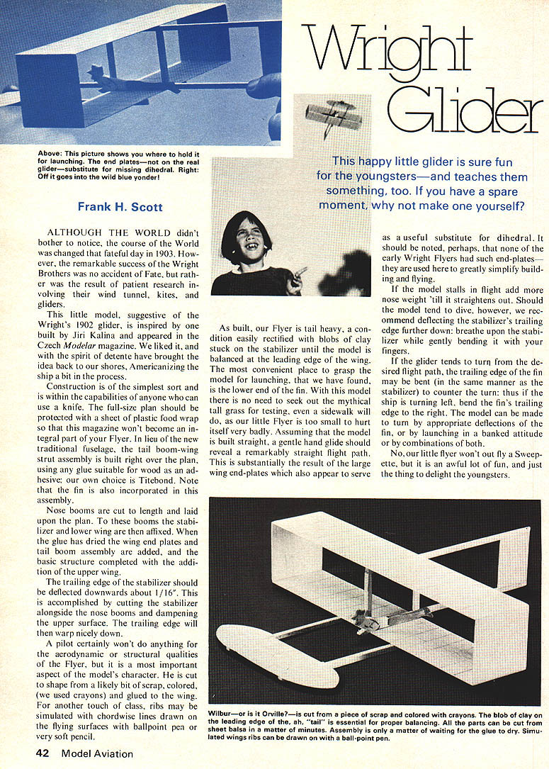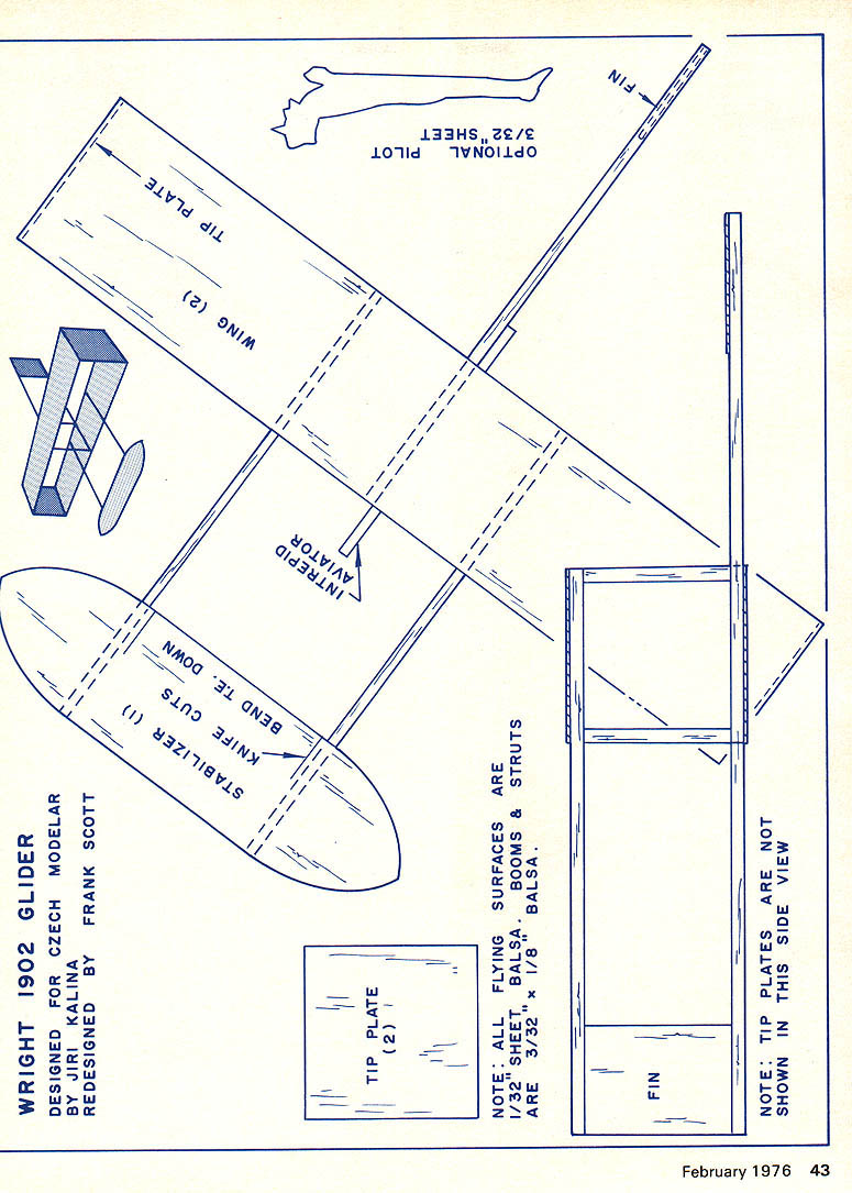 Frank H Scott ALTHOUGH THE WORLD didnt bother notice course World changed fateful day 1903 ever remarkable success Wright Brothers no accident Fate rath er result patient research volving wind tunnel kites gliders little model suggestive Wrights 1902 glider inspired built Jiri Kalina appeared Czech Mode/ar magazine liked spirit detente have brought idea back shores Americanizing ship bit process Construction simplest sort within capabilities anyone can use knife full-size plan should protected sheet plastic food wrap magazine wont become tegral part Flyer lieu new traditional fuselage tail boom-wing strut assembly built right over plan using glue suitable wood ad hesive own choice Titebond Note fin also incorporated assembly Nose booms cut length laid upon plan booms stabi lizer lower wing affixed glue has dried wing end plates tail boom assembly added basic structure completed addi tion upper wing trailing edge stabilizer should deflected downwards about 1/16 accomplished cutting stabilizer alongside nose booms dampening upper surface trailing edge will warp nicely down pilot certainly wont anything aerodynamic structural qualities Flyer important aspect models character cut shape likely bit scrap colored used crayons glued wing another touch class ribs may simulated chordwise lines drawn flying surfaces ballpoint pen very soft pencil Wright Glider As built Flyer tail heavy con dition easily rectified blobs clay stuck stabilizer until model balanced leading edge wing convenient place grasp model launching have found lower end fin model no need seek out mythical tall grass testing sidewalk will little Flyer too small hurt itself very badly Assuming model built straight gentle hand glide should reveal remarkably straight flight path substantially result large wing end-plates also appear serve y little glider sure fun ingstersand teaches ig too have spare vhy make yourself useful substitute dihedral should noted perhaps early Wright Flyers such end-plates used greatly simplify build ing flying model stalls flight add nose weight till straightens out Should model tend dive however rec ommend deflecting stabilizers trailing edge further down breathe upon stabi lizer gently bending fingers glider tends turn de sired flight path trailing edge fin may bent same manner stabilizer counter turn thus ship turning left bend fins trailing edge right model can made turn appropriate deflections fin launching banked attitude combinations both No little flyer wont out fly Sweep ette awful lot fun just thing delight youngsters 42 Model Aviation Above This picture shows hold launching end platesnot real glidersubstitute missing dihedral Right Off goes wild blue yonderl Wilburor Orvilleis cut piece scrap colored crayons blob clay leading edge ah tail essential proper balancing parts can cut sheet balsa matter minutes Assembly matter waiting glue dry Simu lated wings ribs can drawn ball-point pen WRIGHT 1902 GLIDER DESIGNED FOR CZECH MODELAR BY JIRI KALINA REDESIGNED BY FRANK SCOTT ALL SHEET, 3/32 FLY IN G BALSA x 1/8 SURFACES BOOMS & BALSA ARE STRUTS N - \L N NN0 N / N' N / N __ II____________ — ___—-- TE TIP PLATES ARE NOT SHOWN IN THIS SIDE VIEW N N N N N N TIP PLATE 2 NOTE 1/32 ARE FIN