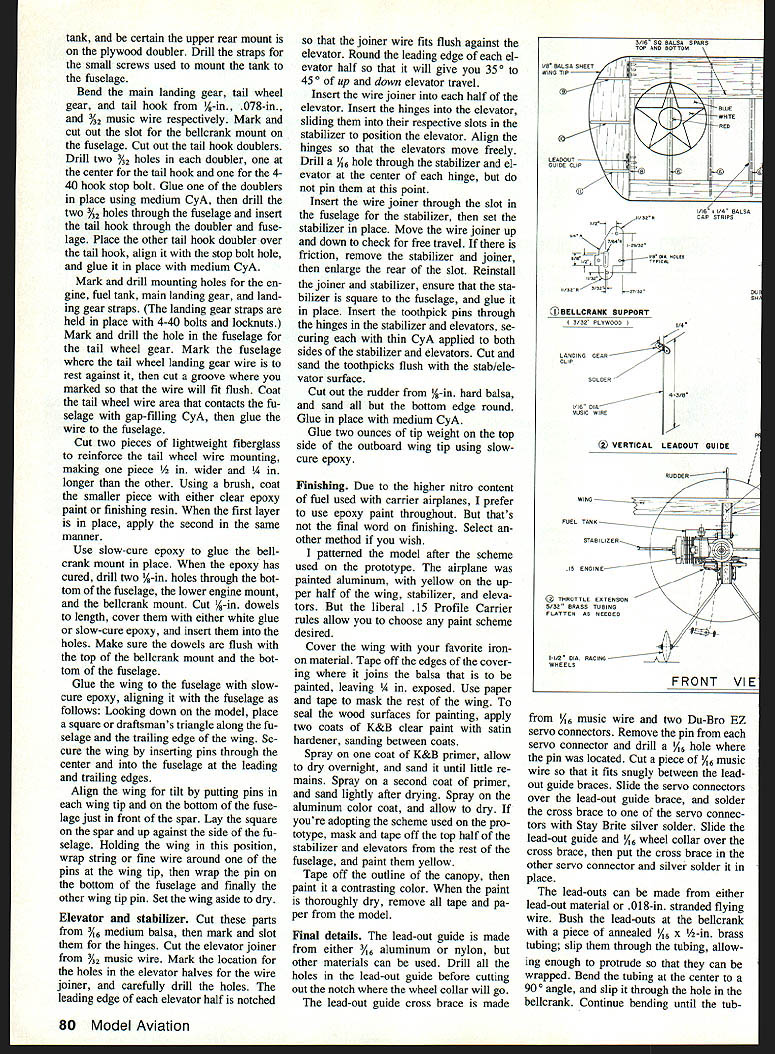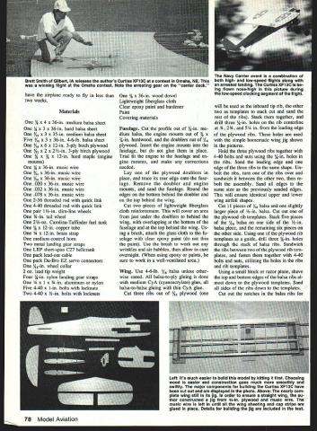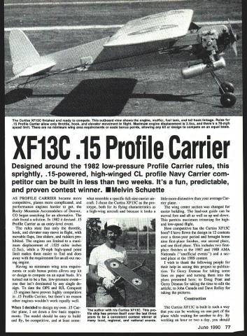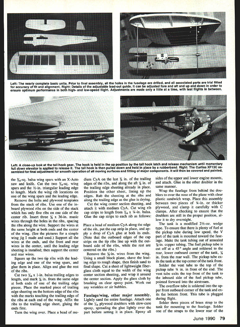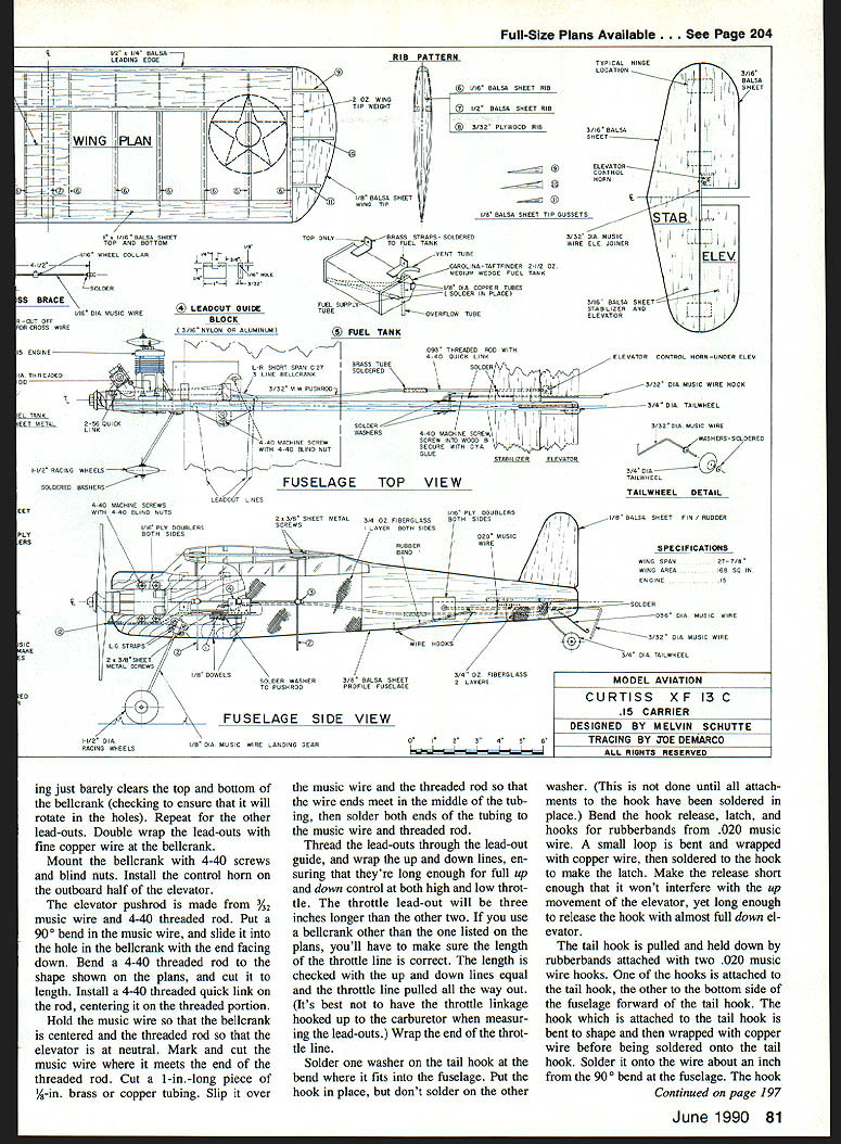 The Curtiss XF13C finished ready compete outboard view shows engine muffler fuel tank tail hook linkage Ruia 15 Profile Carrier allow throttie hook elevator movement flight Maximum engine displacement i 25cc theres 70-mph speed limit no minimum wing area requirements scale bonus points ailowing kit design compete equal basis XF13C 15 Profile Carrier Designed around 1982 low-pressure Profile Carrier rules sprightly 15-powered high-winged CL profile Navy Carrier com petitor can built less two weeks Its fun predictable proven contest winner U Melvin Schuette AS PROFILE CARRIER became competitive planes complicated performance engines harder get Rocky Mountain Aeromodelers Denver CO began searching alternative club found solution 1982 devised 15 Profile Carrier entry-level event rules state throttle hook elevator may move flight movable flaps line sliders rudders pro hibited engines limited maxi mum displacement 1525 cubic inches 25cc 70-mph high-speed point limit makes easier find does away requirement all-out rac ing engine Having no minimum wing area require ments scale bonus points allows kit design compete equal basis Its turned out fun low-pressure event isnt dominated single de sign date OPS RJL Conquest 15 engines have proven highly competitive 15 Profile Carrier theres no reason other engines wouldnt work equally well decided design own 15 Car rier plane set down few basic require ments model should easy build fly competitive least somewhat resemble specific full-size carrier air craft chose Curtiss XFl3C pro totype both its flying characteristics high-wing aircraft because looks little distinctive average Car rier plane wing center section changed easier building lead-out guide can moved fore aft well up down permits maximum trimmiig highand low-speed flight competitive has Curtiss XFl3C have flown design 12 contests over three-year period brought home nine first-place finishes second place third place includes two firstplace finishes 1987 1988 AMA Nationals unofficial events sec ond place 1989 contest wish thank following people help seeing project publica tion Gerry Deneau taking some lines paper turning plans presented Doug Pratt Gerry Deneau taking time edit article John Canada Dave Rolley taking pictures Construction Curtiss XFl3C built such way can working part plane waiting another dry working hour two day should June 1990 77 author Curtiss XF13C pro file ship has proven itseif over last three years consistent contest winner local regional national events have airplane ready fly less two weeks Materials x 36-in medium balsa sheet % x 3 x 36-in hard balsa sheet /i6 x 3 x 35-in medium balsa sheet Five V16 x 3 x 36-in 4-6-lb balsa sheet 6 x 6 x 12-in 3-ply birch plywood Y32 x 2 x 2 -in 3-ply birch plywood % x 3/ x 12-in hard maple engine mounts i/6 x 36-in music wire /32 x 36-in music wire /i6 x 36-in music wire 020 x 36-in music wire 032 x 36-in music wire 078 x 36-in music wire 2-56 threaded rod quick link 4-40 threaded rod quick link pair 1 4n slim-line wheels 3A-in tail wheel 2-oz Carolina-Taffinder fuel tank -in copper tube i4 x 12-in brass strap medium control horn Two metal landing gear straps LRP short-span C27 belicrank pack lead-out cable pack Du-Bro EZ servo connectors A6-in wheel collar 2 oz lead tip weight Four %-in nylon landing gear straps x 1 x u-in aluminum nylon Five 4-40 x 1-in bolts locknuts Two 4-40 x -in bolts locknuts % x 36-in wood dowel Lightweight fiberglass cloth Clear epoxy paint hardener Paint Covering materials Fuselage Cut profile out %-in dium balsa engine mounts out % x %-in hardwood doublers out 6 plywood Insert engine mounts fuselage glue place Trial fit engine fuselage en gine mounts make corrections needed Lay plywood doublers place trace its rear edge onto fuse lage Remove doubler engine mounts sand fuselage Round edges bottom behind doubler top behind wing Cut two pieces lightweight fiberglass cloth reinforcement will cover area just under doublers behind wing overlapping bottom fuselage top behind wing Us ing brush attach glass cloth fu selage clear epoxy paint thin paint Use brush work out wrinides air bubbles allow cure overnight using epoxy paints sure work well-ventilated area Wing Use 4-6-lb A6 balsa unless other wise stated balsa-to-ply gluing done medium CyA cyanoacrylate glue balsa-to-balsa gluing thin CyA glue Cut three ribs out %2 plywood will used inboard tip rib other two templates stack cut sand rest ribs Stack together drill three %-in holes rib centerline 34 2/4 5A leading edge plywood ribs holes used simple homemade wing jig shown pictures Hold three plywood ribs together 4-40 bolts nuts using -in holes ribs Sand leading edge edge three ribs same shape Un bolt ribs turn ribs over sandwich between other two re bolt assembly Sand edges same size previously sanded edges will ensure identical upper lower wing airfoil shapes Cut 11 pieces A6 balsa slightly larger piece -in balsa Cut out plywood rib templates Stack five pieces V16 balsa side -in balsa piece remaining six pieces other side Using plywood rib templates guide drill three -in holes through stack balsa ribs Sandwich ribs between two plywood rib tem plates fasten together 4-40 bolts nuts utilizing holes ribs rib templates Using small block razor plane shave top bottom edges balsa ribs al down plywood templates Sand sides ribs down templates Cut out notches balsa ribs 78 Model Aviation Brett Smith Gilbert IA releases authors Curtiss XF1 3C contest Omaha NE winning flight Omaha contest Note arresting gear carrier deck Navy Carrier event combination both high- low-speed flights along arrested landing Curtiss XF1 3C ing flown nose-high picture during low-speed clocking segment flight Left Its much easier build model kitting first Choosing wood easier construction goes much smoothly swiftly maior components building Curtiss XF13C have cut out displayed photo Above nearly com plete wing still its jig order ensure straight wing au thor constructed jig -in plywood music wire m