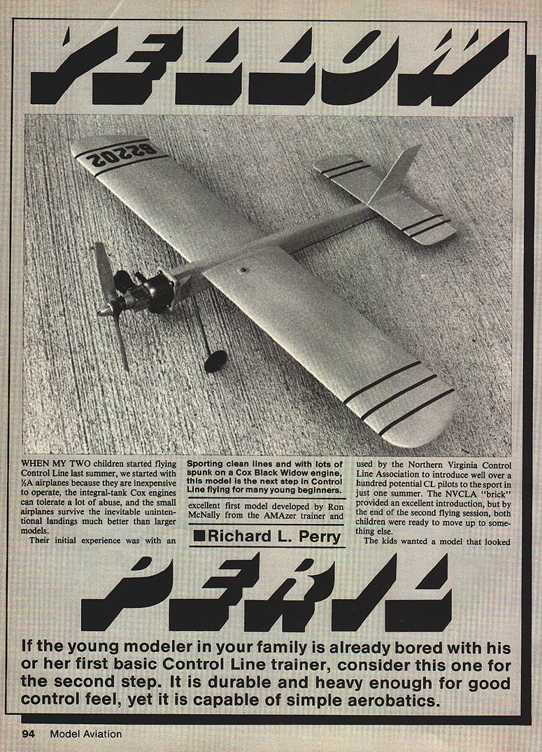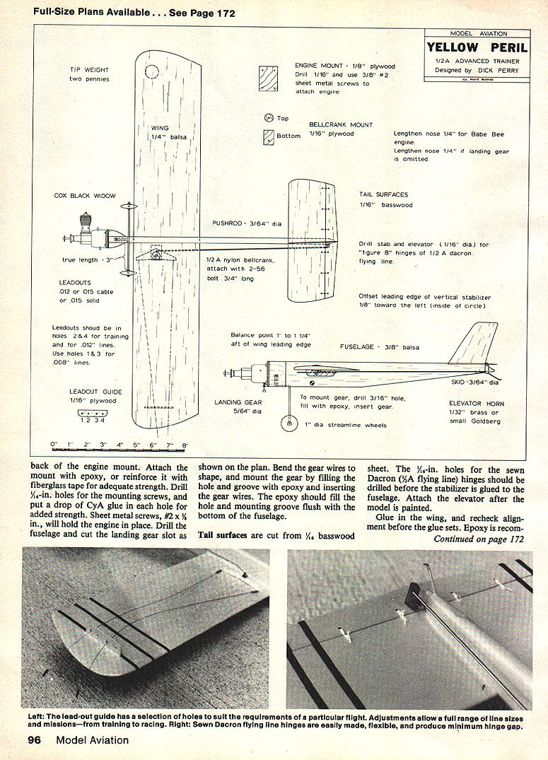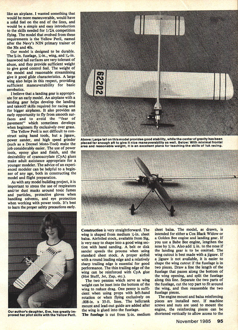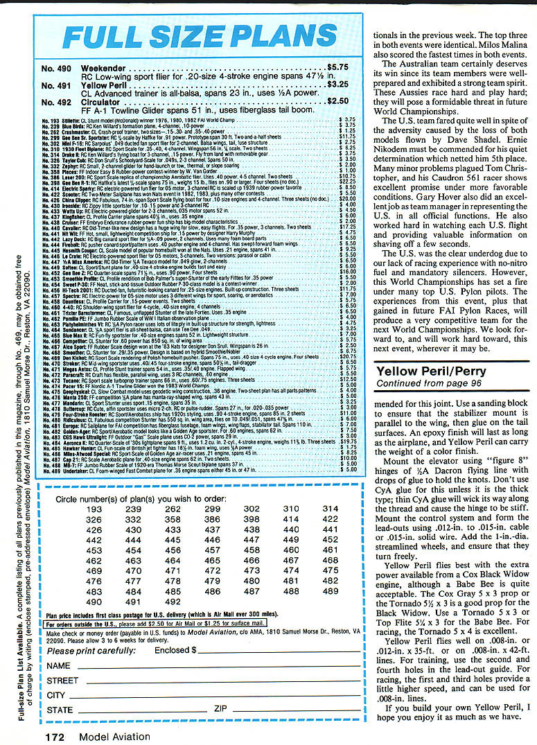NO OCR TEXT like airplane wanted something would maneuverable would have solid feel end lines would simple easy introduction skills needed l/2A competition flying model evolved requirements Yellow Peril named after Navys N3N primary trainer 30s 40s model designed durable 1-in fuselage /4-in wing A-in basswood tail surfaces very tolerant abuse provide sufficient weight give good control feel weight model reasonable streamlining give good glide characteristics large wing also helps respect providing sufficient maneuverability basic aerobatics believe landing gear appropri ate early model An airplane landing gear helps develop landing takeoff skills required racing bigger airplanes also provides early opportunity fly smooth sur faces avoid fear pavement sometimes develops beginners fly exclusively over grass Yellow Peril difficult con struct using hand tools jigsaw power sander high speed grinder such Dremel Moto-Tool make job considerably easier use power tools epoxy glue finish desirability cyanoacrylate CyA glues make adult assistance appropriate younger modeler advice experi enced modeler can helpful begin ner age both constructing model flight preparation As model building project important stress use respirators and/or dust masks around toxic fumes particles protective gloves handling solvents eye protection working power tools Its best learn proper safety precautions early Construction very straightforward wing shaped medium A-in sheet balsa Airfoiled stock available Sig very easy shape good wing sec tion hand sanding belt disk sander speeds process using standard sheet stock proper airfoil round leading edge relatively sharp trailing edge essential good performance thin trailing edge wing can reinforced CyA glue Hot Stuff Jet Zap etc two pennies serve wing weight can inset bottom wing reduce drag penny suffi cient using props left-hand rotation flying exclusively 008-in x 35-ft lines bellcrank mount lead-out guide added after wing glued fuselage fuselage cut %-in medium sheet balsa model drawn intended either Cox Black Widow Golden Bee engine landing gear use Babe Bee engine lengthen nose / Also add / nose landing gear omitted wing cutout best made jigsaw jigsaw available easier shape wing cutout fuselage two pieces Draw line length fuselage passes along bottom wing opening split fuselage along line Separate two parts fuselage cut top part fit around wing reassemble two fuselage pieces engine mount balsa reinforcing pieces installed next machine screws nuts used mount engine reinforcing pieces can shortened vertically allow access November 1985 95 Above Large tall model provides good stability center 0 gravIty has placed far enough aft give nice maneuverability well Below minimal frontai area reasonable weIght excellent plane teaching skills 1/2A racing authors daughter Eve has greatly Im proved pilot skills Yellow Peril Full-Size Plans Available. See Page 172 TIP WEIGHT two pennies COX BLACK WIDOW true length 3 LEADOUTS 012 015 cable 015 sOlid Leodouts shoud holes 2&4 training 012 lines Use holes 1 & 3 008 lines LEADOUT GUIDE 1/16 plywood 12 34 WING 1/4 balsa j\, ENGINE MOUNT 1/8 plywood Drill 1/16 use 3/8 e2 sheet metal screws attach engine O Top mount gear drill 3/16 hole LANDING GEARfill epoxy insert gear 5/64 dia 1 dia streamline wheels YELLOW PERIL 1/2A ADVANCED TRAINER Designed DICK PERRY BELLCRANK MOUNT Bottom 1/16 plywood PUSHROD 3/64 dia 1/2 nylon bellcrank attach 2-56 bolt 3/4 long Balance point 1 1 1/4 aft wing leading edge Lengthen nose 1/4 Babe Bee engine Lengthen nose 1/4 landing gear omitted TAIL SURFACES 1/16 basswood Drill stab elevator 1/16 dia figure 6 hinges 1/2 dacron flying line Offset leading edge vertical stabilizer 1/6 toward left inside circle FUSELAGE 3/8 balsa ELEVATOR HORN 1/32 brass small Goldberg 0 12 3 4 5 6 7 8 back engine mount Attach mount epoxy reinforce fiberglass tape adequate strength Drill A6-in holes mounting screws put drop CyA glue hole added strength Sheet metal screws #2 x will hold engine place Drill fuselage cut landing gear slot shown plan Bend gear wires shape mount gear filling hole groove epoxy inserting gear wires epoxy should fill hole mounting groove flush bottom fuselage Tail surfaces cut A6 basswood sheet A-in holes sewn Dacron AA flying line hinges should drilled before stabilizer glued fuselage Attach elevator after model painted Glue wing recheck align ment before glue sets Epoxy recoinContinued page 172 Left lead-out guide has selection holes suit requirements partIcular flight Adjustments allow full range line sizes missionsfrom training racing Right Sewn Dacron flying line hinges easily made flexible produce minimum hinge gap 96 Model Aviation MODEL AVIATION / -a SKID -3/64 dia Circle numbers plans wish order II II II II II II 302 398 438 447 458 466 473 480 487 310 414 440 449 460 467 474 481 488 314 422 441 452 461 468 475 482 489 193 326 426 442 453 462 469 476 483 490 239 332 430 444 454 463 470 477 484 262 358 433 445 456 464 471 478 485 299 386 437 446 457 465 472 479 486 491492 I Plan price Includes first class postage br US delIvery Air Mall over 300 mIles I Make check money order payable US funds Model Aviation 510 AMA 1810 Samuel Morse Dr Reston VA 22090 Please allow 3 6 weeks delivery Please print carefully Enclosed $__________________________________ 1 NAME STREET CITY I __________________________ ZIP __________________________ STATE ________________________ Q als previous week top three both events identical Milos Malina also scored fastest times both events Australian team certainly deserves its win since its team members wellprepared exhibited strong team spirit Aussies race hard play hard will pose formidable threat future World Championships US team fared quite well spite adversity caused loss both models flown Dave Shadel Ernie Nikodem must commended quiet determination netted him 5th place minor problems plagued Tom Chris topher Caudron 561 racer shows excellent promise under favorable conditions Gary 