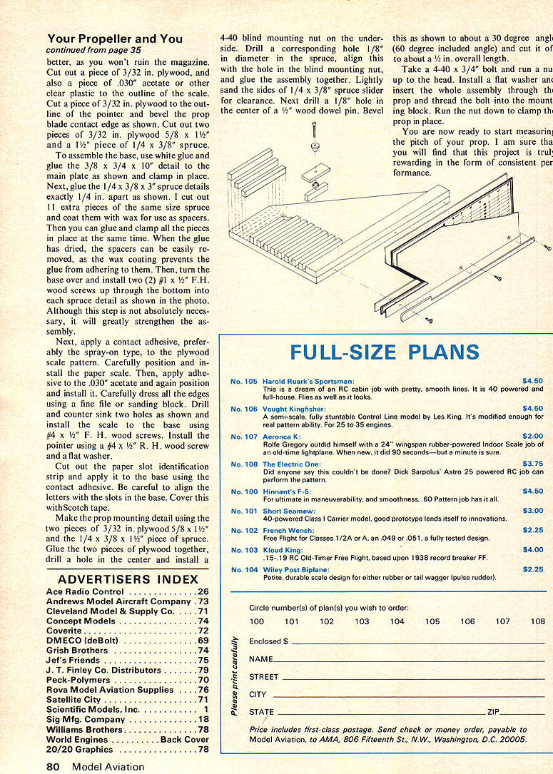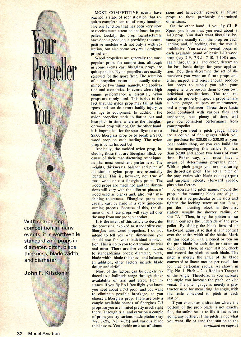 MOST COMPETITIVE events have reached state sophistication re quires complete control function function has very slow receive much attention has pro peller Luckily prop manufacturers have done good job providing com petitive modeler wide se lection also some very well designed propellers Wood propellers generally popular props competition although some events cast fiberglass props quite popular Nylon propellers usually reserved sport flyer selection propeller material usually deter mined two things namely applica tion economics events high engine performance essential nylon props rarely used due fact nylon prop may fail high rpms can severe bodily injury damage equipment addition nylon propeller tends flatten out lose pitch time fiberglass wood prop will other hand impractical sport flyer use $500 fiberglass prop break $100 wood prop landing nylon prop far best bet Ironically molded nylon prop cluding fiberglass filled cause manufacturing techniques consistent performers weights thicknesses balance pitch similar nylon props essentially identical however true wood cast fiberglass props wood props machined dimen sions will vary different pieces wood used blanks also ma chining tolerances Fiberglass props usually cast hand very time-con suming process Because di mension props will vary over map prop another intent article describe processes involved standardize cast fiberglass wood propellers intend tell what dimensions should use individual applica tion up determine trial error five critical factors standardizing props diameter pitch blade width blade thickness balance addition other factors include blade design airfoil Most factors can quickly re duced ballpark range through either availability trial error stance fly FAI free flight know need about 7-3 prop want eliminate possible breakage choose fiberglass prop couple available brands fiberglass 7-3 props limited pretty much right Through trial error couple props try various blade pitches say 7-2 7-2 7-3 7-3 various blade thicknesses decide set dimen sions henceforth rework future props previously determined dimensions other hand fly CL B Speed know need about 7-10 prop dont want fiberglass cause usually ruin prop landing nothing else cost prohibitive select several props available brand basic 7-10 wood prop say 7-9 7-9 7-10 7-10 again through trial error determine best basic design applica tion determine set di mensions want future props either inspect reject enough produc tion props supply requirements rework own individual specifications tool re quired properly inspect propeller pitch gauge calipers micrometer prop balancer three basic tools combined various files sandpaper plus plenty time will give consistent performance propeller First need pitch gauge couple fine gauges can purchase $2000 $3000 local hobby shop can build accompanying article less $200 about two hours time Either way must have means determining propeller pitch pitch gauge measuring theoretical pitch actual pitch prop varies blade velocity rpm airplane velocity forward speed plus other factors operate pitch gauge mount prop mounting block align perpendicular slots tighten locking screw nut Next put mounting block first station usually shortest radius slot bring pointer up contacts underside pro peller sliding block forward backward adjust contact over entire width blade Mark off location pencil pen prop blade slot station blade station check record pitch blade pitch merely angle blade converted linear motion per revolution particular radius As shown Fig No Pitch Radius x Tangent Angle Therefore increase angle increase pitch vice versa pitch gauge merely pro tractor used measuring angle scale converted pitch station encounter situation bottom prop blade exactly flat safest bet file flat before going further pitch what want file sand station continued page 34 32 Model Aviation CI St ti ar J Propeller desired value corresponding station both blades should same Pre vious experience has shown can balance pitch between blades station within- /4 inch will close enough may also find blade pitch consistent over entire blade length may vary say 4-in pitch hub 6-in pitch tips perfectly OK long both blades consistent another After prop pitched both blades next check record blade thick nesses widths using caliper use dial caliper reading 001 find convenient However otber tool technique accurate 005 can used satisfactory results thickness larger desired value can reduce filing sand ing top side blade too thin much can Similarly blade widths should checked similar corrective techniques employed After pitch thickness width established station blend reworks form smooth contour tween stations Now verify exact radius blade can done simply accurately using round pin dowel diameter hole prop using calipers measure blade pin tip de termme actual radius must take account diameter pin Either add subtract one-half diameter dependent technique Next check balance using re liable technique Several inexpensive prop balancers available will pro duce satisfactory results preceding steps have followed should find minor touch-up required balance prop sanding lightly top side heavy blade attempt balance prop trimming radius blade pitch gauge presented article evolved gauge made own use prior other suitable gauge being available original model used machined 3/4 plexiglass base plate chemically etched stainless steel scale larger scale about pound heavier besieged requests friendly Rat Race competitors gauges made dozen using cast steel-filled epoxy base made RTV rubber mold project didnt go further since gauges cost us about $7500 apiece made couple cast plastic scale method although much cheaper too practical due time involved prototype units essentially bullet-proof gauge presented however bit accurate pos sibly practical because its lighter weight proper care should last lifetime materials required quite basic readily available Substitu tions can made sug gested materials techniques However critica