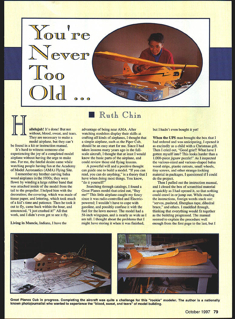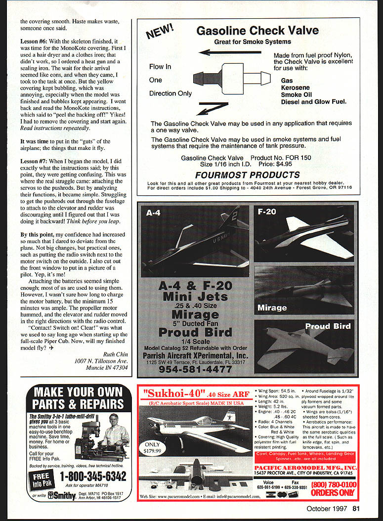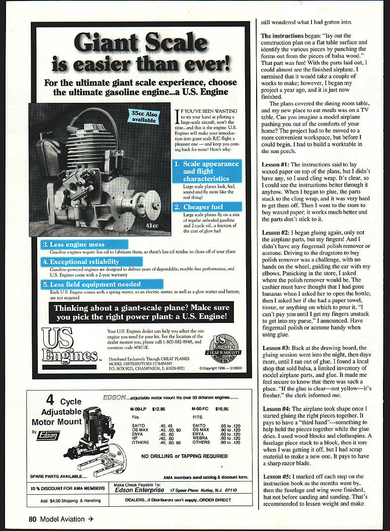 Y re Never Old 000 Hallelujah Its done blood sweat tears necessary make model airplane cant found kit instruction manual Its hard witness someone else experiencing joy completed model airplane having urge make fateful desire came watching people having fun Academy Model Aeronautics AMA Flying Site remember brother carving balsa wood airplanes 1930s flown winding large rubber band attached inside model tail propeller helped him decoration covering made tissue paper lettering took much kids time patience took out fly came back within hour announced just crashed work didnt get see fly Living Muncie Indiana have advantage being near AMA After watching modelers display skills crafting kinds airplanes thought simple airplane such Piper Cub should easy start Since taken lessons years ago fullscale aircraft thought least would know basic parts airplane could review old flying lessons powerful will positive thought can guide build model can read can anything theory have doing things know yourself Searching through catalogs found Great Planes model cried out Buy little airplane caught fancy since radio-controlled Electricpowered wouldnt have cope gasoline possibly confuse fuel lawn mower model 58-inch wingspan nearly wide am tall thought about problems might have storing finished hadnt bought yet UPS man brought box ordered anticipating opened excitedly child Christmas gift cried out Good grief What have gotten myself looks harder 1000-piece jigsaw puzzle As inspected various-sized various-shaped balsa wood strips plastic cutouts small wheels tiny screws other strange-looking material packages questioned could project pulled out instruction manual closed box scrambled material quickly opened nothing could crawl jump out reading instructions foreign words stack out servos pushrod fiberglass tape dihedral brace others muddled through thinking everything would fit together building progressed manual seemed explain procedure well enough first page last October 1997 79 U Ruth Ch~ Great Planes Cub progress Completing aircraft quite challenge rookie modeler author nationally known photojournalist wanted experience blood sweat tears model building 4 Cycle Adjustable motor mount fits over 60 different engines AdjustM-60-LP $1296M-60-FC $1695 FitsFITS Motor4045 90SAtTO65 120 120 ByENVA40 60ENYA60 120 HP/40 60WEBRA80 120 OTHERS40 60 gOTHERS80 120 NO DRILLING TAPPING REQUIRED SPARE PARTS AVAILABLE.AMA members send catotog & discount term DEALERS.it Distriberors cant sup9tv.ORDER DIRECT still wondered what gotten instructions began lay out construction plan flat table surface identify various pieces punching forms out pieces balsa wood part fun parts laid out could almost see finished airplane surmised would take couple weeks make however began project year ago just now finished plans covered dining room table new place eat meals TV table Can imagine model airplane pushing out comforts home project moved convenient workspace before could begin build worktable sun porch Lesson #1 instructions said lay waxed paper top plans didnt have used cling wrap Its clear could see instructions better through anyhow began glue parts stuck cling wrap very hard get off went store buy waxed paper works much better parts dont stick Lesson #21 began gluing again airplane parts fingers didnt have fingernail polish remover acetone Driving drugstore buy polish remover challenge no hands wheel guiding car elbows Panicking store asked polish remover would cashier must have thought gone bananas asked open bottle asked paper towel tissue anything pour cant pay until get fingers unstuck get purse announced Have fingernail polish acetone handy using glue Lesson #3 Back drawing board gluing session went night days until ran out glue found local shop sold balsa limited inventory model airplane parts glue made feel secure know such place glue clearnot yellowits fresher clerk informed Lesson #4 airplane took shape once started gluing right pieces together pays have third handsomething help hold pieces together glue dries used wood blocks clothespins fuselage piece stuck block tore getting off scrap material make new pays have sharp razor blade Lesson #5 marked off step instruction book months went fuselage wing finished before sanding sanding Thats recommended lessen weight make 80 Model Aviation $400 Shipping & Handling Make Check Payable 10% DISCOUNT FOR AMA MEMBERS Edson Enterprise l7Speer Place NufIep NJ 07110 covering smooth Haste makes waste someone once said Lesson #6 skeleton finished time MonoKote covering First used hair dryer clothes iron didnt work ordered heat gun sealing iron wait arrival seemed like eons came took task once yellow covering kept bubbling annoying especially model finished bubbles kept appearing went back read MonoKote instructions said peel backing off Yikes remove covering start again Read instructions repeatedly time put guts airplane things make fly Lesson #7 began model did exactly what instructions said point getting confusing real struggle came attaching servos pushrods analyzing functions became simple Struggling get pushrods out through fuselage attach elevator rudder discouraging until figured out doing backward Think before leap point confidence increased much dared deviate plans big changes practical ones such putting radio switch next motor switch outside also cut out front window put picture pilot Yep its Attaching batteries seemed simple enough us used using However wasnt sure long charge motor battery minimum 15 minutes ample propeller motor hummed elevator rudder moved right directions radio control Contact Switch Clear what used say long ago starting up full-scale Piper Cub Now will finished model fly Chin 1007 N Tillotson Ave Muncie IN 47304 auth IIIi1ii soline Check Valve Great Smoke Systems Flow Direction Only Made fuel proof Nylon Check Valve excellent use Gas Kerosene Smoke Oil Diesel Glow Fuel Gasoline Check Valve may used application requires way valve Gasoline Check Valve may used smoke