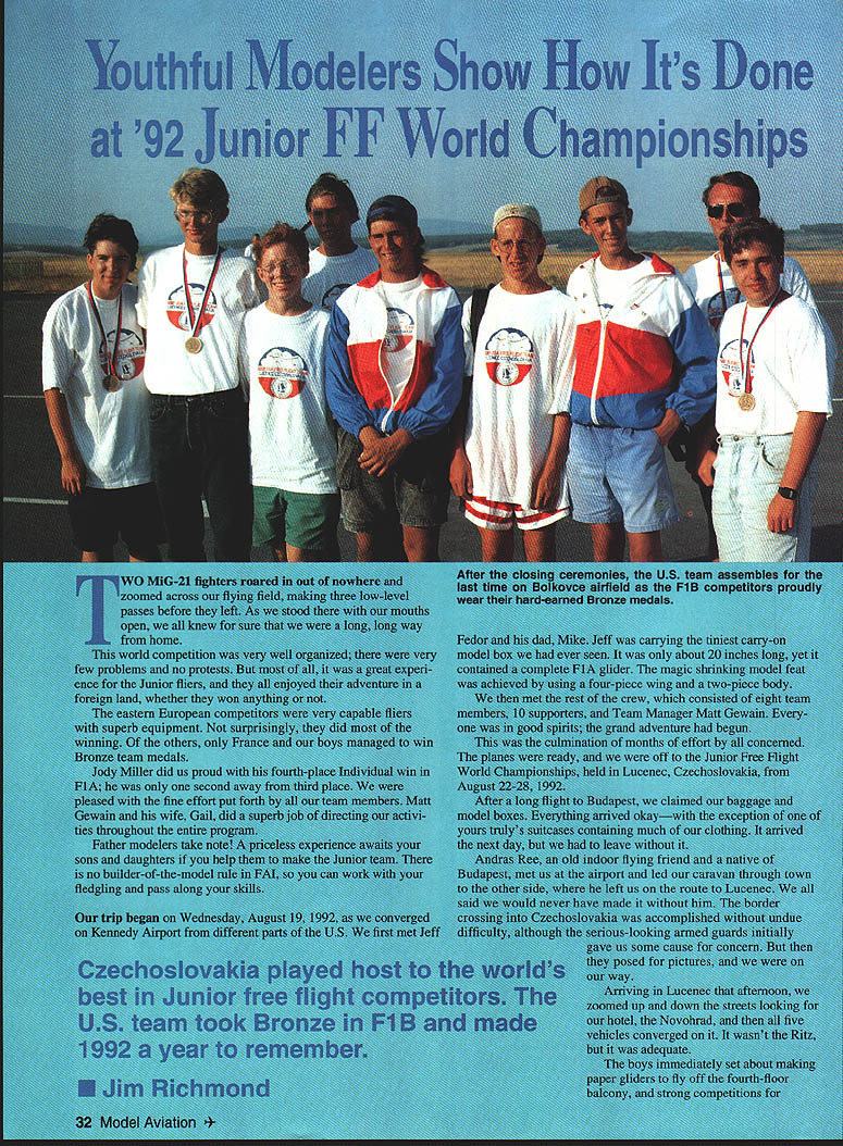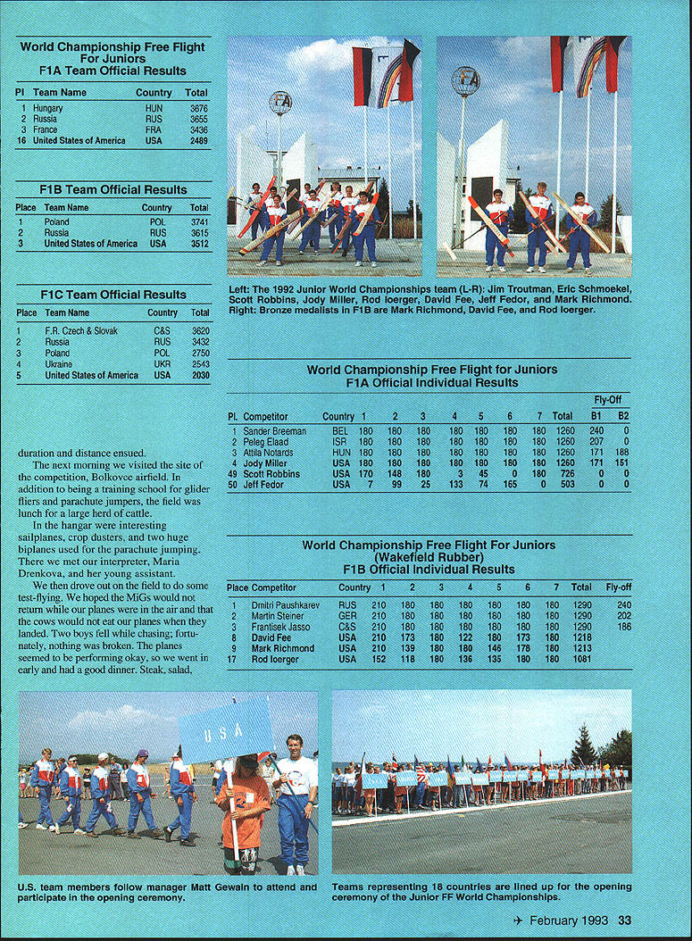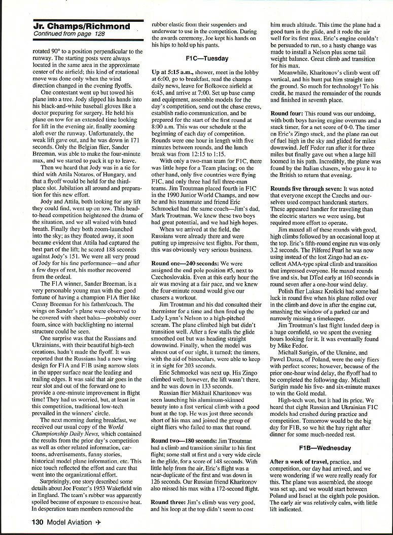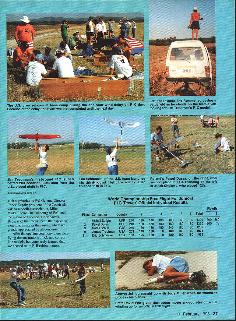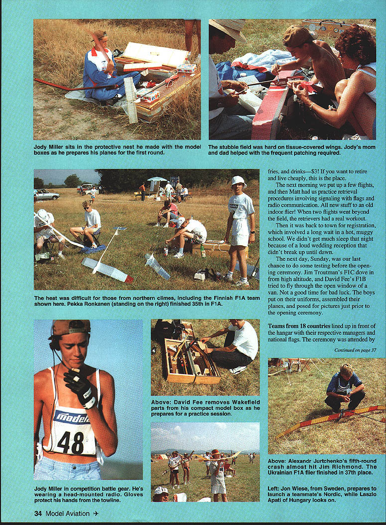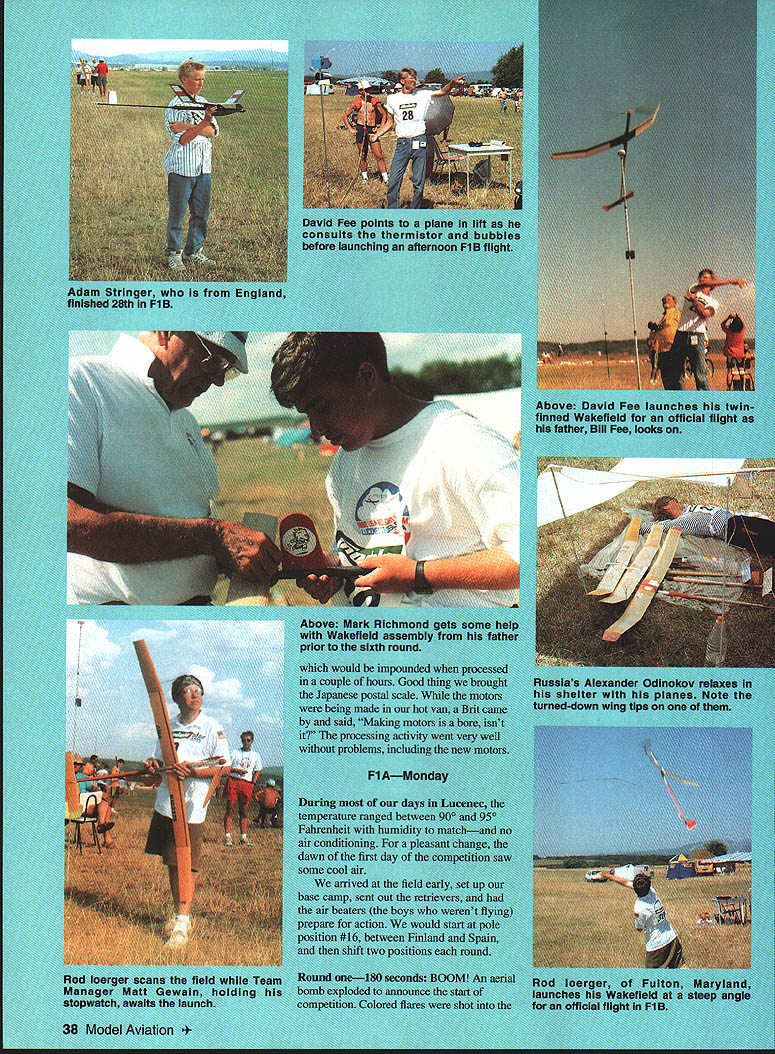 NO OCR TEXT NO OCR TEXT NO OCR TEXT NO OCR TEXT NO OCR TEXT NO OCR TEXT As above enough some serious contenders go far incorporate speed control power system well premise finer power control further extends battery reserves involved installations speed control connected receiver throttle channel usual switch servo operated auxiliary channel does really work sure seems someIve witnessed subject AULD serious modelers usually use either sailplanes OTs Both effective contenders fact earlier year witnessed relatively simple though large 01 easily beat contemporary sophisticated sailplane fancy gadgets course can work other way around too lot depends pilot luck point can safely consider either model type next AULD project variety speed controls market some come opencircuit assembliesie uncased units Examples latter include Flightec product line use Personally prefer install such assemblies native state rather use some suitable protective enclosure course E-modelers just install em also have done past rate Ive grown prefer housed approach ease installation model prevent some commonplace motor brush dust coating electronics afford some degree physical protection control event flight mishap read crash Three months photos illustrate what mean begin providing some strain relief speed control receiver cable carefully 9 gluing short length plastic tubing somewhere assembly example pictured Ive glued tubing top integrated circuit drop CyA cyanoacrylate glue some accelerator tubing needed usually work well tubing case piece Du-Bro green heat-shrink type shrunk receiver cable slipped through glue dry soldered place accordance speed control instructions Next configure simple wooden box just nicely fits outline particular printed circuit board pictured uses 1/M ply base frame outline /8-in-thick balsa strip chosen frame height such tallest components clearedexcept very tallest ie MOSFETs metal-oxide semiconductor field-effect transistors protrude purpose placed path flowing air within plane frame side has notch required exiting wiring made wire pass large enough Sermos connectors clear time entire circuit assembly can easily installed removed wooden enclosure Also frame has several wraps heavy threadglued cyanoacrylateto further strengthen assembly Note thread cut away wiring notch CyA has set inner floor box example outlined Vi x /4-in foam saddle tape provide perimeter rest PCB assembly keeps little soldered wire protrusions bottom PC hoard hitting ply floor Note also foam tape rest cleared near wire exit clearance notchthis because massive wire/solder blob large-gauge wires connected bottom PC board enclosure completed setting top cover place shown lamination Ai ply inner-fitting A6 balsa plate cover has two holes access speed control adjustment screws shown plastic tape holds cover place speed controls installed using double-stick Velcro pieces assembly no exception visible anyway piece material bottom wooden box mates its coun terpart suitably adhered inside fuselage Ive using Radio Shack part #64-2345 years feel good simple enclosure Phil Thayer himself man behind Flightec regular attendee KRC meet told liked whole idea too think youll find well worth effort Earlier column wrote Mitch Poling lengthy career writing about things Electric Mitch has written Electric column Model Builder magazine about 13 years Prior column now long defunct RC Sportsman tabloid has also written numerous feature articles several other magazines author book Building Flying Electric Powered Model Aircraft published Kalmbach fantastic thing occurred 92 KRC Electric Fly Seven writers Electric columns attendance unhappy see Mitchs column published preceding three issues MB felt Electric needs much exposure possible modeling press After part hobby now growing leaps bounds us appears obvious Electric destined quietly power modeldom 5 future Maybe good place go back earlier part column reread bit personal philosophy always try close column very upbeat waybut given situation Mitch Poling bit difficult month Ill just offer following Thank Mitch youve done both Electric movement over years doubt Id have good Electric life Ive enjoyed years Electric writing Thanks again Mitch Please enclose SASE corres pondence youd like reply hampslRichmond Continued page 39 Round five Jody switched modified Czech Mate because wind flight very high another max Scott went up okay overly tight turn brought him down 45 seconds Jeff s lowlaunch problems continued down 74 seconds Ukrainian flier Alexandr Jurtchenko zoom-launched plane dove straight crash feet Hey gliders can dangerous Round six Jeff went up first good flight lost view below horizon 165 seconds Jody tangled lines another flier during mass launch able refly went up again quickly zoomed good thermal yet another max Scott first landed dead air line still attached reflight glider did wingover dive released line save plane Miraculously thermaled away carrying line finally landed corn two miles away found because its radio Good flight no time given because attached line Both Andreas Motsch Birgit Puttner German team dropped round after unbroken string maxes Birgit few girls competing championships Both mother accomplished FlA flier enthusiastic participants Round seven max Jody along five other flierswould clean seven rounds Everyone watched apprehension thought mom going have nervous breakdown launch great gave plane lots mental lift soared high sky max flyoff Spanish FlA flier Roberto Rodriguez sprained ankle Finnish chaser suffered dehydration concluded FlA flying hard contestants chasers moms also surprised learn storks deliver babiesa group attacked Finnish FlA model causing severe damage Scott made max Jeff s launch problems ended day him FlA fiyoff240 seconds Six contestants maxed out would have flyoff evening Jody checked wind velocity 8-10 mph over runway Because shift wind direction starting line Continued page 130 128 Model Aviation hampslRichmond Continued page 128 rotated 90 positi