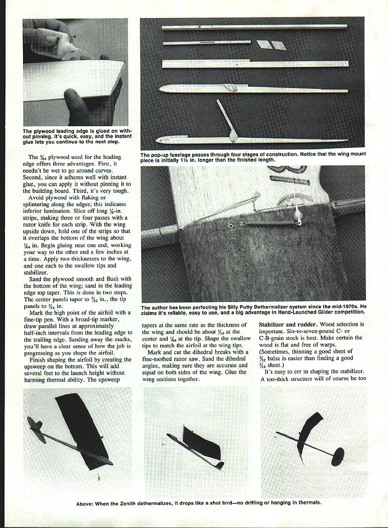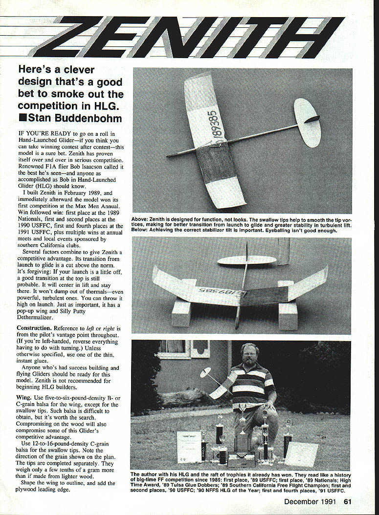 design thats good bet smoke out competition HLG U Stan Buddenbohm IF YOURE READY go roll Hand-Launched Gliderif think can take winning contest after contestthis model sure bet Zenith has proven itself over over serious competition Renowned FlA flier Bob Isaacson called best hes seenand anyone accomplished Bob Hand-Launched Glider HLG should know built Zenith February 1989 immediately afterward model won its first competition Max Men Annual Win followed win first place 1989 Nationals first second places 1990 USFFC first fourth places 1991 USFFC plus multiple wins annual meets local events sponsored southern California clubs Several factors combine give Zenith competitive advantage Its transition launch glide cut above norm Its forgiving launch little off good transition top still probable will center lift stay wont dump out thermalseven powerful turbulent ones can throw high launch Just important has pop-up wing Silly Putty Dethermalizer Construction Reference left right pilots vantage point throughout youre left-handed reverse everything having turning Unless otherwise specified use thin instant glues Anyone whos success building flying Gliders should ready model Zenith recommended beginning HLG builders Wing Use five-to-six-pound-density B- C-grain balsa wing except swallow tips Such balsa difficult obtain its worth search Compromising wood will also compromise some Gliders competitive advantage Use 12-to-16-pound-density C-grain balsa swallow tips Note direction grain shown plan tips completed separately weigh few tenths gram made lighter wood Shape wing outline add plywood leading edge December 1991 61 Heres clever Above Zenith designed function looks swallow tips help smooth tip vor tices making better transition launch giide greater stability turbulent lift Below Achieving correct stabilizer tilt important Eyeballing isnt good enough author wHin ma flLU ana ran OT tropnies already has won read like history big-time FF competition since 1959 fIrst place 89 USFFC first place 89 Nationals High Time Award 89 Tuisa Glue Dobbers 89 Southern California Free Flight Champion first second places 90 USFFC 90 NFFS HLG Year first fourth places 91 USFFC plywood used leading edge offers three advantages First neednt wet go around curves Second since adheres well instant glue can apply pinning building board Third its very tough Avoid plywood flaking splintering along edges indicates inferior lamination Slice off long A-in strips making three four passes razor knife strip wing upside down hold strips overlaps bottom wing about % Begin gluing near end working way other end few inches time Apply two thicknesses wing swallow tips stabilizer Sand plywood smooth flush bottom wing sand leading edge top taper done two steps center panels taper 42 tip panels /16 Mark high point airfoil fine-tip pen broad-tip marker draw parallel lines approximately half-inch intervals leading edge trailing edge Sanding away marks 11 have clear sense job progressing shape airfoil Finish shaping airfoil creating upsweep bottom will add several feet launch height harming thermal ability upsweep tapers same rate thickness wing should about 1/16 center % tip Shape swallow tips match airfoil wing tips Mark cut dihedral breaks fine-toothed razor saw Sand dihedral angles making sure accurate equal both sides wing Glue wing sections together Stabilizer rudder Wood selection important Six-to-seven-pound C- C-B-grain stock best Make certain wood flat free warps Sometimes thinning good sheet 3A2 balsa easier finding good 1/ sheet Its easy err shaping stabilizer too-thick structure will course too Above Zenith dethermalizes drops like shot birdno drifting hanging thermals plywood leading eage giusa out pinning Its quick easy instant glue lets continue next step pop-up Tuselage passes inrough four stages construction Notice wing mount piece initially 1 longer finished length w autnor nas perfecting Silly Putty Dethermalizer system since mid-i 970s claims its reliable easy use big advantage Hand-Launched Glider competition b Full-Size Plans Available Page 192 POP-UP PARTS 1/16 DIA BRASS TUBE 3323/16 00 BRASS TUBE 020 MUSIC WIRE 1 POP-UP SPRING WA \\ \ CGlID REAR VIEW1/IS LIGHT B-GRAIN 10 141b BALSAv LEAD NOSE WEIGHT STRIPS 164 1/8 PLYWOOD LEFT HANDERS REVERSE STABILIZER TILT AND RUDDER OFFSET WASH IN RIGHT WING ONLY FINISH FORMULA-U POLYURETHANE SMEAR ON THEN WIPE OFF WITH TISSUE LEAVING VERY THIN REEDUE WAIT 24 HOURS AND REPEAT SOT TIMER SILLY PUTTY TIMER AVALABLE FROM GARY BUDDENBOHM SEED MENHAROT RD WESTMINSTER CA 92663 $S PLUS $1 SHIPPING ALSO AVAIASLE PROM PAl MODEL SUPPLY BEST LAUNCH 20 DEG RIGHT BANK 60-70 06G UP ANGLE heavy thats too thin fragile prone warp rudder should full /16 bottom good joint stabilizer yet very thin top save weight Since rudder withstands little stress use lightest wood Fuselage pop-up wing method produces Glider rigid glued durable totally reliable Never experience has failure pop-up wing lets airplane drop like shot bird dethermalizer activates Use good-quality l0-to-14-pound-density balsa fuselage Make nine-inchlong wing mount piece main fuselage separately Sand until straight square make sure fit well together Drill hole /16 brass tube rout cavity rectangular brass tube rotary router use Dremel Moto-Tool No 193 cutter job can done drill needle file Drill cavity pop-up spring coils making sure offset centerline File A6-sq groove centered along bottom wing mount piece just above spring coil cavity within /16 hole groove accepts spring arm wing mount down position 1/16 PLYWOOD SIDE PLATES DRILL 5B4 CLEARANCE HOLE IN FUSELAGE END ONE SIDE PATE TAP OTHER FOR 2-SE MACH SCREW 2-553/B ROUND HEAD MACH SCREW EMTH BY STAN BUDDENBOHM DESIGNED 259DRAWN 7/91 SPAN 18 WEIGHT 35-DR GMS SOT TIMER AIRFOL HIGH POINT lANE S-SIb C-GRAIN WASH N LEFT WING ONX CUT THOU CUT HAP WAY THRU BEND DOWN 1/16 & GLUE .--lD-lEb C-GRAIN Place film glue along groove insert rectangular brass tube should fit just below surface prevent interfe