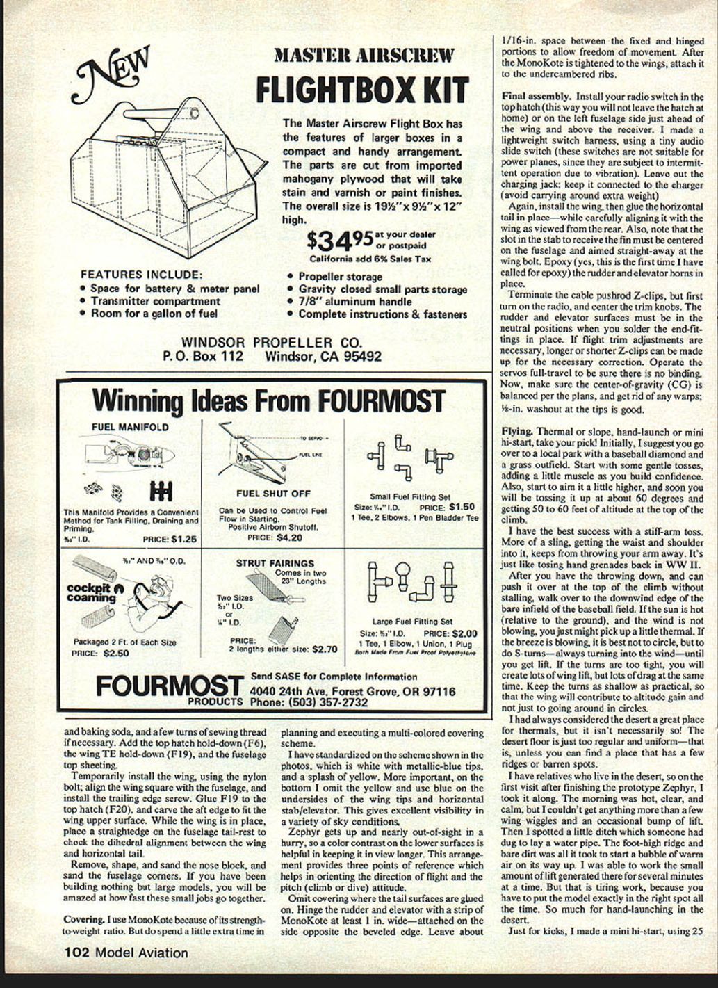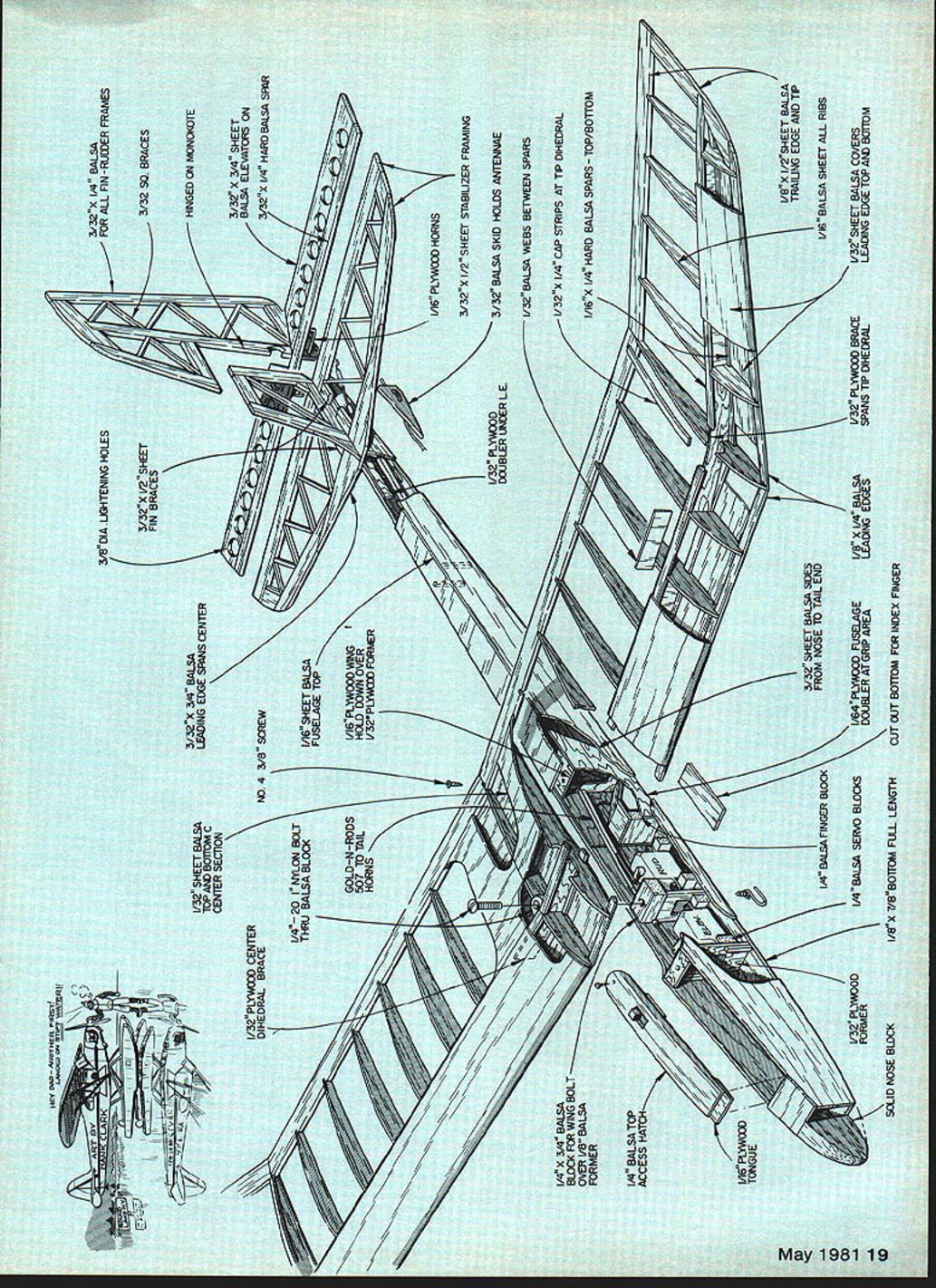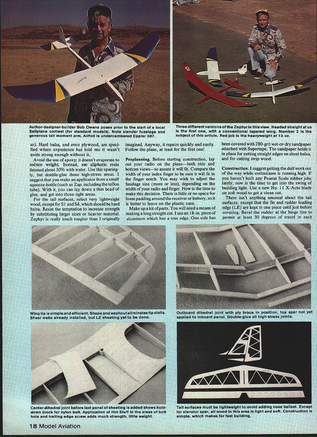 NO OCR TEXT NO OCR TEXT Author-designer-builder Bob Owens poses prior start local Sailplane Contest standard models Note slender fuselage generous tail moment arm Airfoil undercambered Eppler 387 Hard balsa plywood speci fied experience has told wasnt quite strong enough Avoid use epoxy doesnt evaporate reduce weight Instead use aliphatic resin thinned about 30% water Use sparing ly double-glue high-stress areas suggest make apolicator small squeeze-bottle such Zaptpflon tube can layof glue get ti tail surfaces 54it wood except SI S4 balsa Resist temptatior substituting larger yr really much nree arneren versions Zephyr view Headed straight us first conventional tapered wing Number 2 subject article Red Job heavyweight 13 oz imagined Anyway repairs quickly easilybeen covered 280-grit wet-or-dry sandpaper Follow plans least first oneattached Supertape sandpaper holds place cutting straight edges sheet balsa Preplanniag Before starting construction layand cutting strip wood out radio plansboth side bottom viewsto assure will fit Compare theConstruction suggest getting dull w width index finger sure will fit inof way enthusiasm ri finger notch may wish adjust theyou havent built Peanut Sc fuselage size less depending thelately now time get inL width radio finger Now time tobuilding light Use new No 11 make decision little ii ace foron soft wood get clean cut foam padding around receiver ry soit isnt anything unusui better leave plastsurfaces except fin ar Make upakitofparts Youvedge LE kept ng long straight cut uscovering Bevel aluminum has truepermit least 30 14EY PW NJOThEP Rs OSF~RII 3/32X 1/4 BALSA 3/8DIA LJ3-ITENING HOLES/IFOR ALL FlN-RUER FRAMES 3/32X V2 SHEET13/32 SQ BRACES FIN BRACES /32 SHEET BALSALEADINGEOGE SPANS CENTER 10P BOTTOM C CENTER SECTION I/32PLYflO CENTER DIHEDRAL BRACENO4 3/B SCREW3/32X /4 HARD BALSA SFR I/4 20 NYLON BOLT THRU BALSA BLOCK HOLD DOWN OVER V32PLW FORNER I/16X /4 HARD BALSA SPARS TOP/BOTTOM VBX I/2SHEET BALSA TRAIUNG EDGE AND TIP 1/32 PLOD1/4 BALSA SERVO BLOCKSI/64PLtwOo FUSELAGEI/B X 1/4 BALSA1/32 PLYWCO BRACE1/32 SHEET BALSA CWERS DOUBLER AT GRIP AREALEADING EDGESSPANS TIP DIHEDRALLEADING EDGE TOP AM BOTTOM SOLID NOSE BLOCKI/BX T/8BOTTOM FIlL LENGTHCUT OUT BOTTOM FOR INDEX FINGER FULL-SIZE PLANS AVAILABLE. SEE PAGE 132 5/52 SPAR-WOWOW-- W7 -.- . n-r4 _____ BALSAWRAWH VERTICAlwir SOWIWASPARSWEBN IA ROLE 2W2WZWI_WI N10 01/2 TE STOCK WAILD WWA SAME AS IOil{jREj~1FLAT NOTTOW ERCEPT sSTICK WONOKOTE TO IoTo L~7iWAJV~ALATTEACH OW AFTER SHBIMKNW IIWREORAL BRACES S-~1/52 NOTES ALL RALSA PARTS CONTEST GRADE SOFT ERCEPT WINO & ELED SPARS SI & OH ARE WARS FOR H 2 BALANCE LEVEL AT WING BOLT J FD FBNO205W SCREW WOOWED PAPER CUP OPTORAL TOW HOOK WN OWEN 0 BA ENDEO-N-BOOSSALUGAN NO SOi1 WADDER ELEG HOIRN I/IN PLO/bITS 3/02 ITjRECEIDER OoER%\At FI4JF5Nj~j7-TB I/HF I/NO PlO DOSBIERFA FUSE SIDES 5/52FID FIN ssoBONOGOTE GINHES TI5/FI SERVO WLOCKS FINOER WESTISOTUNRO WEIIDATLIWED OT NO CONDAIT I/A S D/W ANOER NDTH-COTaIT FBI SODA STRAW IWING SPAN021K AFTER FOSE ISAOGEBWAKDP WA WOLEIRI FFR FASE BOTTOM 12WWINOAREA330 ODIN FFRAIOATLINED 851WEIGAT LASS WADE 5 00 AIRFOIL EPPLER 5W FWI/R_____________ IOI-I/HSI-5/ARRLGANDOERLDCK5/SD O5FANFIILFSFN SOAWLERSz 1/52 PLY CUTWWGT EDDESIGNED ADRAWNWT WOW OWENS TO FIT F direction elevator similarily beveled Wing Pin down lower spar wing outer rib dihedral break Add vertical least same travel Notch rudder panel blocking up 1/32-in allow shear webbing dihedral brace Finish off elevator accept control horns Leave sheeting later LE also blocked up adding top spar Wet spar last rib tail structure pinned-down ample time height ribs Pin down trailing edge TE facilitate bending down tip glue set up hard tip glue ribs place except omit Continued page 98 20 Model Aviation WITfl ama DU155 spars EflO one-piece wing strongthanks shear webs fully sheeted leading edge forms rigid structural box Tail surfaces fragile adequate ..hors completed framework ready cover weIghed 3 02 wIthout radio Careful weight control needed prevent climbing 502 Use thinned aliphatic resin sparingly pre-sand balsa parts Author refers fuselage building half-shell Kraft KPS 18 servos built mounted screws permit easy removal Note routing control rods antenna conduit Theres ample space 6-ch Kraft receiver skinny case 225 mAh batterywith case bantamsize servos Fuselage width can bevaried accommodate own radio componentswithin reason FUN SCALE IS ilERE Easier Fly Yet Very Maneuverable Over 20 step-by-step building illustrations easier follow photos Lands Like Trainer Ideal 2nd Trainer Novice 19-25 Engine 19-40 Eng Span 51 Area 490 sq 18-20 oz wing loading 3*-4 lbs Upright Engine Can Built Flown 7 Days Due New Construction Techniques WILL FLY AS SLOW AS PIPER CUB MODEL Write free Catalog JEMCO 1305 Foothill Dr Vista CA 92083 714 724-3242 Zephyr Owens Continued page 20 Build inner wing panels same man ner join outer panel inner panel just before adding top spar Turn plans over build opposite wing Join right left wing halves first adding center dihedral brace add bolt block center rib cut fitted between LE spar between block TE Add LE sheeting following sequence lower inner panels lower outer panels upper inner panels upper outer panels Next add lower center panel upper center panels Sand weigh sand some Since sheeting usually warped edges must trim off slice straightedge mentioned earlierbefore trying glue wing fuselage will built up half shellso speak insufficient space down inside fuselage much work after boxed Everything possible will completed prior installing left side fuselage Attach doublers F7 F9 inside fuselage side F2 Use Hot Stuff Zap Jet make left right side Throughout instructions will refer Hot Stuff can take pick of cyanoacrylate glues Lay right side over side view plans glue place nose block Fl formers F3 F4A F4B F5 fuselage tapers between F3 FS width cross members must carefully measured achieve good fit left side put place Before gluing parts place lay straightedge ac