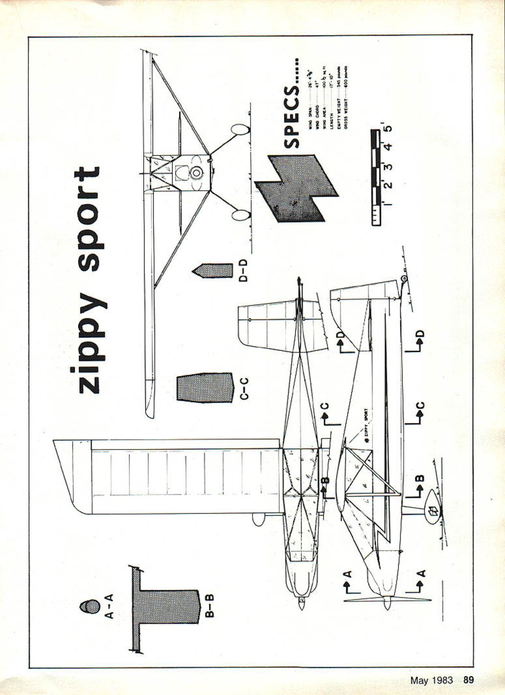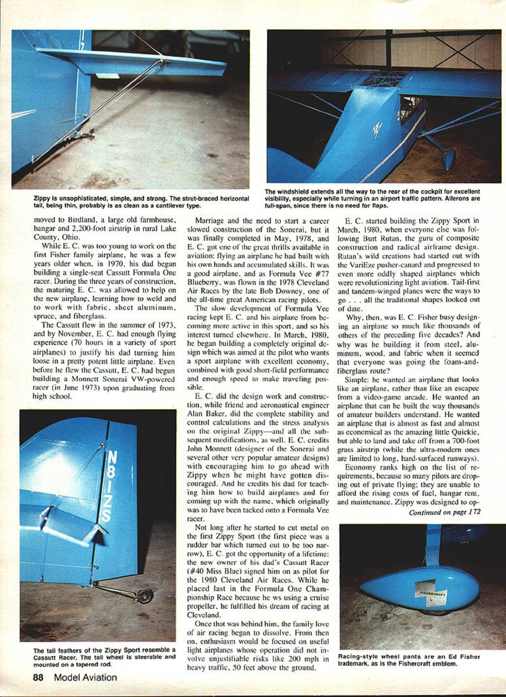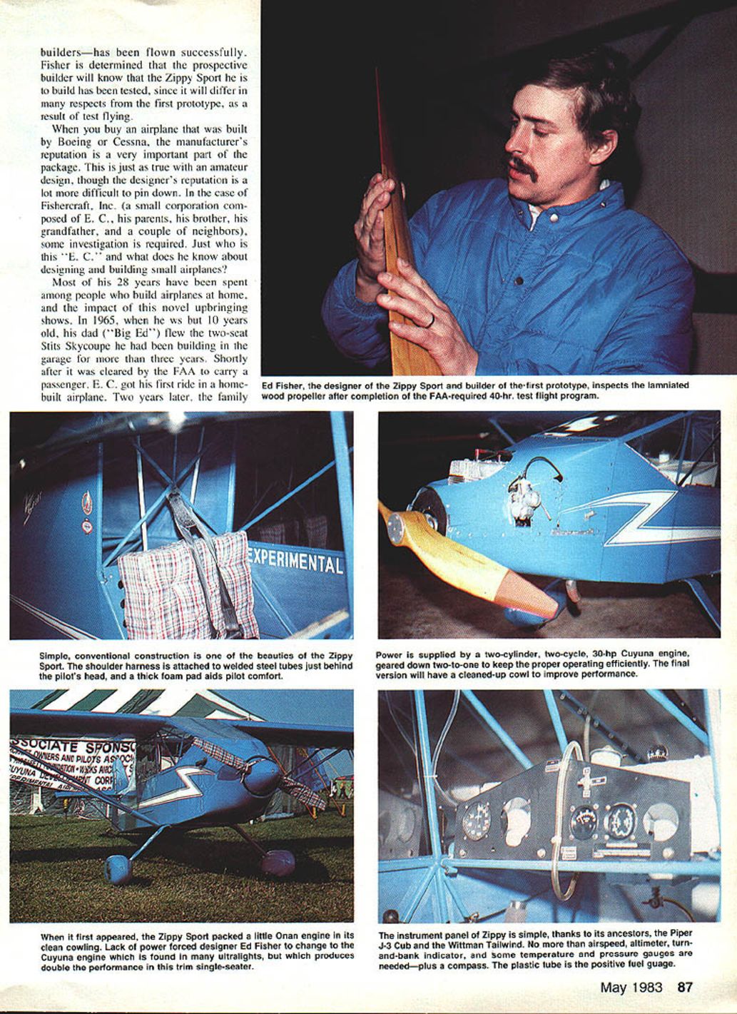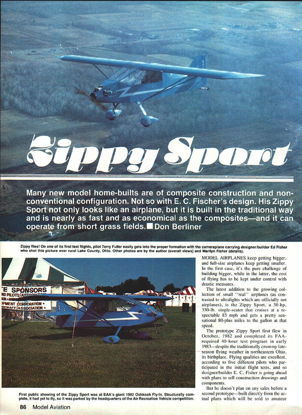 MODEL AIRPLANES keep getting bigger full-size airplanes keep getting smaller first case its pure challenge building bigger latter cost flying has kept under control drastic measures latest addition growing col lection small real airplanes con trasted ultralights officially airplanes Zippy Sport 30-hp 350-lb single-seater cruises re spectable 85 mph gets pretty sen sational 80-plus miles gallon speed prototype Zippy Sport first flew October 1982 completed its FAArequired 40-hour test program early 1983despite traditionally crummy lateseason flying weather northeastern Ohio its birthplace Flying qualities excellent according five different pilots par ticipated initial flight tests designer/builder E C Fisher going ahead plans sell construction drawings components doesnt plan sales before second prototypebuilt directly ac tual plans will sold amateur 86 Model Aviation Zippy flies its first test flights pilot Terry Fulier easily gets proper formation cameraplane carrying designer/builder Ed Fisher shot picture over rural Lake County Ohio Other photos author overall views Marilyn Fisher details First public showing Zippy Sport EAAs giant 1982 Oshkosh Fly-In Structurally com plete yet fly parked headquarters Air Recreation Vehicle competition buildershas flown successfully Fisher determined prospective builder will know Zippy Sport build has tested since will differ respects first prototype result test flying buy airplane built Boeing Cessna manufacturers reputation very important part package just true amateur design though designers reputation lot difficult pin down case Fishercraft Inc small corporation com posed E C parents brother grandfather couple neighbors some investigation required Just E C what does know about designing building small airplanes Most 28 years have spent among people build airplanes home impact novel upbringing shows 1965 ws 10 years old dad Big Ed flew two-seat Stits Skycoupe building garage three years Shortly after cleared FAA carry passenger E C got first ride homebuilt airplane Two years later family May 1983 87 Ed Fisher designer Zippy Sport builder thefirst prototype inspects lamniated wood propeller after completion FAA-required 40-hr test flight program Simple conventional construction beauties Zippy Sport shoulder harness attached welded steel tubes just behind pilots head thick foam pad aids pilot comfort pPower supplied two-cylinder two-cycle 30-hp Cuyuna engine geared down two-to-one keep proper operating efficiently final version will have cleaned-up cowl improve performance first appeared Zippy Sport packed little Onan engine its clean cowling Lack power forced designer Ed Fisher change Cuyuna engine found ultralights produces double performance trim single-seater instrument panel Zippy simple thanks its ancestors Piper J-3 Cub Wittman Tallwind No airspeed altimeter turn and-bank indicator some temperature pressure gauges neededplus compass plastic tube positive fuel guage moved Birdland large old farmhouse hangar 2200-foot airstrip rural Lake County Ohio E C too young work first Fisher family airplane few years older 1970 dad began building single-seat Cassutt Formula racer During three years construction maturing E C allowed help new airplane learning weld work fabric sheet aluminum spruce fiberglass Cassutt flew summer 1973 November E C enough flying experience 70 hours variety sport airplanes justify dad turning him loose pretty potent little airplane before flew Cassutt P C begun building Monnett Sonerai VW-powered racer June 1973 upon graduating high school Marriage need start career slowed construction Sonerai finally completed May 1978 E C got great thrills available aviation flying airplane built own hands accumulated skills good airplane Formula Vee #77 Blueberry flown 1978 Cleveland Air Races late Bob Downey all-time great American racing pilots slow development Formula Vee racing kept E C airplane coming active sport interest turned elsewhere March 1980 began building completely original de sign aimed pilot wants sport airplane excellent economy combined good short-field performance enough speed make traveling pos sible P C did design work construc tion friend aeronautical engineer Alan Baker did complete stability control calculations stress analysis original Zippyand sub sequent modifications well P C credits John Monnett designer Sonerai several other very popular amateur designs encouraging him go ahead Zippy might have gotten dis couraged credits dad teach ing him build airplanes coming up name originally have tacked onto Formula Vee racer long after started cut metal first Zippy Sport first piece rudder bar turned out too nar row E C got opportunity lifetime new owner dads Cassutt Racer #40 Miss Blue signed him pilot 1980 Cleveland Air Races placed last Formula Cham pionship Race because ws using cruise propeller fulfilled dream racing Cleveland Once behind him family love air racing began dissolve enthusiasm would focused useful light airplanes operation did volve unjustifiable risks like 200 mph heavy traffic 50 feet above ground P C started building Zippy Sport March 1980 everyone else fol lowing Burt Rutan guru composite construction radical airframe design Rutans wild creations started out VariEze pusher-canard progressed oddly shaped airplanes revolutionizing light aviation Tail-first tandem-winged planes ways go aditional shapes looked out date P C Fisher busy design ing airplane much like thousands others preceding five decades building steel alu minum wood fabric seemed everyone going foam-andfiberglass route Simple wanted airplane looks like airplane rather like escapee video-game arcade wanted airplne can built way thousands amateur builders understand wanted airplane almost fast almost economical amazing little Quickie able land take off 700-foot grass airstrip ultra-modern ones limited long hard-surfaced runways Economy ranks high list re quirements because pilots drop ing out private flying unable afford rising costs fuel