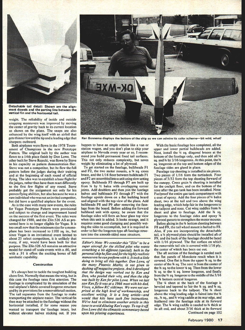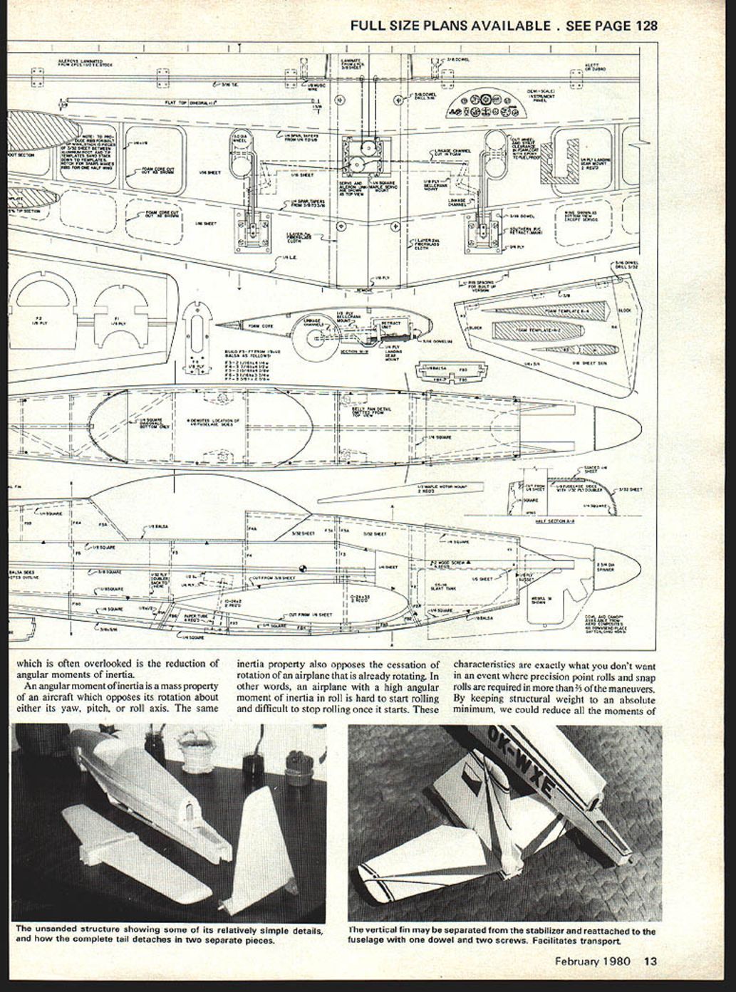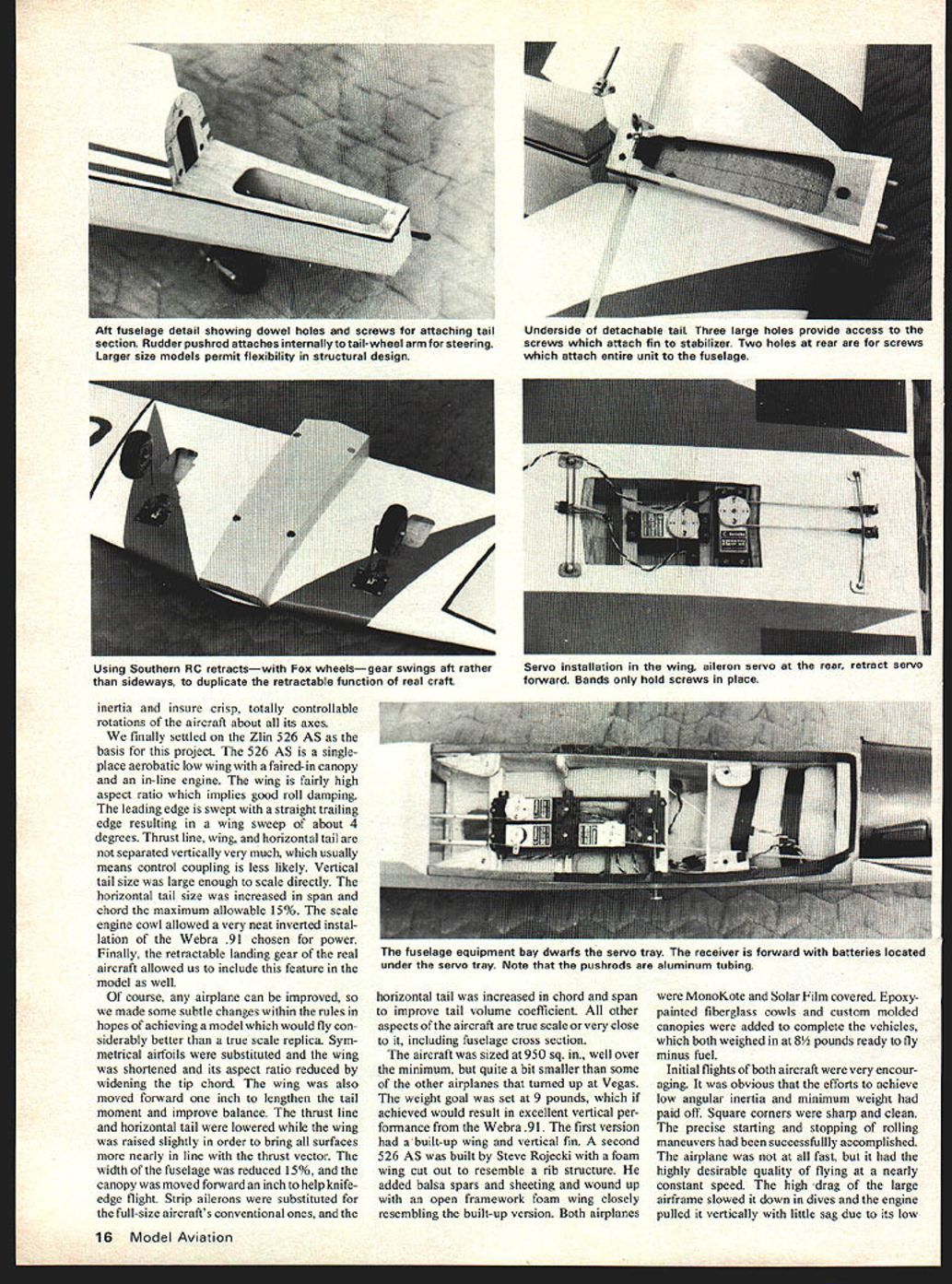 NO OCR TEXT NO OCR TEXT I SCENT I- I CSKCBc-CO lICK I I, ROCK-~c Alliii II JfpgTiC rI ICSONOOK PSFT IllsP5060110 0* FROB 106F0OOSKICK 0300 3~CO NKKKCOAIE01ItQS3i l&LCMCOCOBCCSOKSAL FIN SINK OKOCCISO ICSO0 PLOICSPLO0-00' r OCIKOO3KL573 OC OKKOKII OOEKLOCOSIK I..KOONlFS2PLO ICC SOUK 04013 pOKOOmI 40530 TMOSOKKL Naturally enough Don felt should seek aircraft similar layout Phoenix Zlin 526 726 series offered variety designs somewhat like Phoenix low-wing long-tail moment vehicles slightly swept wings Just finding full-scale aerobatic bird lines along success ful model design going enough however arrive winning design totally new event purpose avoid model flying characteristics stress scale realism decided go large light Large add realism presentation ease attitude recognition pilot judge Also large add drag slower flight again realism also help keep airplane 1200 box maneuvers performed Light weight considered essential vertical performance minimizing wing loading would allow sharp square comers flaps Another advantage light weight aerobatic aircraft Seen rear color-scheme lines emphasize feeling forward motion tenna strung stabilizer tip 12 Model Aviation Well-executed nose cowling really mean much Details ot tibergiass cowi snow up we. shotnote handling 4.m asn4 tho *sonInn Mir nnnnmnfl Just another picture provide another eyeview sne color scneme 11101 IS unarime Brown no Ice Mnlc fInuthrnusnl mumfflsr FULL SIZE PLANS AVAILABLE SEE PAGE 128 AICASONS LOAPJC/KAILWAASE7$5/SKOAKL PSOAOPCO oocsocxPSCMSATSSIALCCT n5/NACENT SAC III I S/SFLAT TOP SSAOSOLrCI S/A ISOCK 50 P55COMAI/ASPASTAPESS ACAS STACK SPACES/L/5S/SEALKM /LOS OP S/TA SCT P575555 ALLSACA SOOT ASK CT1 COT SACS/SBEAPtATPS SANK STACK1-U ACTAC PAN SCAM MASKS SAS TON ONE COLT AK/Sot5Ao5~OS MONET - X SET *I-2PM51 SAra S/lA SONTAIIfiAAA1AM NE iS/IA CSIAL-0515451C jF 05/IS ACAECttP tIZVCN II /S/ AGEMACAT POAS COATCCCNACCS~ SACASOC OCITSJ PANEL/Cl PS SIS/INOS ICS1/AMALSOp55 PCS 5/5505/SPM/CPBS MELLC PA ACCOLH OAMCS~ SOMI I/A SNUASO I I/S PCCI/A CCC Ii~2F /6II-I/-6-/vII//OSSOASK ACOOCENLACACICS OPI X KOCCOAOKkC /0 POSECCOK NOES _____________________________________________ III ThI jO fli AI EL PM II/A A/ALE MOCCA MO/NTCUT FRAN/NPUSECSOE ASKS IK SESOLOSCEKTSICK/AC PLO 00/MAPS/NO SOEKC IT IPASACNRO lASS PEAPSACALPSKLTION 00 I/S MACSMPTACONPSO7T- NOKOSjS/AC SOAPS rIIU/SSSOAAK~~ I/AS/C/ASS0I U[I II pIFS / H0500050/SC C/SPATS NOCCIOMA010 1/SOPLO1/ [ CUCTACAC 5/ASCOEC I I/N So/SECSET KACM/SF jMgj0I/SPLO5~ ISN-IS I/SNCUOSE] NLAOS CANE II / MOSPANI I/SN/C/COCKI/SM/AIOiMSj-ACOAS ~CUASE S SUNKCUT PACM I/S N/SECI II/MM/TO/CNL ASK CANOPY SE/CP1no 0550 CASASSICTS N/ASS/SN I CKASNKSO PLACE ----S often overlooked reduction inertia property also opposes cessation characteristics exactly what dont want angular moments inertia rotation airplane already rotating event precision point rolls snap An angular moment inertia mass property other words airplane high angular rolls required 3T maneuvers aircraft oppotes its rotation about moment inertia roll hard start rolling keeping structural weight absolute either its yaw pitch roll axis same difficult stop rolling once starts minimum could reduce moments February 1980 13 I I unsandL A/SSBCONAC /SSASSAC US SEA resmivemy simpie details complete tail detaches two separate pieces SACS ISS/odS 555 SES/Sy uc aeparaoeo orom inc stanhlizer reattached fuselage dowel two screws Facilitates transport i ysHIToo rU L 5QUARE RETRACT BEAM OUT TO BLOCS PLODD 5H0W 0 Up d\m ALTERNATE WING CONSTRUCTiON IS 3/3Z BALSA RIBS WITH SAME SPARS LEADING TRAILING EDGES 3/32 SHEET FRONT CECKING AEROCOMPOSITE CANOPY RUDDER & ELEVAlOR NYRODS TO SERVOS 3/8 BALSAN MIDDLE FAIRLEAD 6CKTO TAlL FOUR NO 2 SCREWS SECURE COWLING TO FUSELAGE I/8PIWJOD GUSSETS lOP AND BOTTOM WEBRA 91 ENGINE 2 3/4DIA- SPINNER AEROCOMPOSITES COWLING SCALE TO FIT 1/2 MAPLE ENGINE MOUNT . RECHESlOF-2 2 1/32 PLYWOOD FUSELAGE DOUBLER FROM F-I BELLY N IS CEMENTED 10 BOlTOM OF WING FIRST -24 SCREWS TO SECURE WING THRU 5/8 DOWELS 3A6 DOWELS IMBED INlO FOAM TO ANCHOR L G I/4 PLYVOD PLATFORM FOAM CORE IN RUDDER AND FIN II/4X3/4TE /16 PLYWXfl BOX3/16 X 1/4 FIN POSTI ENCASES STABILIZER1/16 SHEETING 5A6 DOWELS LOCKBALSA RUDDER FOST 1N TO FUSELAGE 3 /8 SQTOP ANDALL SCREWS HERE 3011DM FAIRLEAD 5/ 1600 WELFOR HORN 4-40 SCREWS MOUNT FIN BASETO BOX 4 BALSA DORSAL FOAM CORES / // WS I\~IssFiNPOST /GOLDBERG1/4 X 1/2 BALSA STABLIZER LE 5/16 DOWEL- 3/32 HOLE FOR HORN 1 1/2 DIA TAILWHEEL 1/4 SQ DIAGONALS 1/8 BALSA SIDE RINELS F-I 10 TAL3/16u X 3/8 BOTTOM KEEL V4SQ BOTTOM LONGERONS 10-24 REAR WING HOLD SCREVJS ThRJ 5/8DOWELS 1/8 MUSIC WIRE TOI/I& SHEET BALSATOP AND BOTfOM AILERON SERVOSV16 X 1/4 CAP STRIPS OVER FOAM 1 1/2 TRAILING EDGE STOCK DOUBLED FOR AILERONS 2 RETRACTABLE BELLCRANK ON 1/8 PLYWOOD PLATFOFA 1/4 X BALSA LEADING EDGEHOLLOWED BALSA BLOCK 3DIA MAIN WHEELS SOUTHERN RETRACT SYSTEM FROM SERVO POWER ONLY February 1980 15 1/4 HARD BALSA SPAR FRONT AND REAR TOP AND BCIlTCM inertia insure crisp totally controllable rotations aircraft about its axes finally settled Zlin 526 AS basis project 526 AS singleplace aerobatic low wing faired-in canopy in-line engine wing fairly high aspect ratio implies good roll damping leading edge swept straight trailing edge resulting wing sweep about 4 degrees Thrust line wing horizontal tail separated vertically very much usually means control coupling less likely Vertical tail size large enough scale directly horizontal tail size increased span chord maximum allowable 15% scale engine cowl allowed very neat inverted instal lation Webra 91 chosen power Finally retractable landing gear real aircraft allowed us include feature model well course airplane can improved made some subtle changes within rules hopes achieving model would fly con siderably better true scale replica Sym metrical airfoils substituted wing shortened its aspect ratio reduced widening tip chord wing also moved forward inch lengthen tail moment improve balance thrust line horizontal tail l